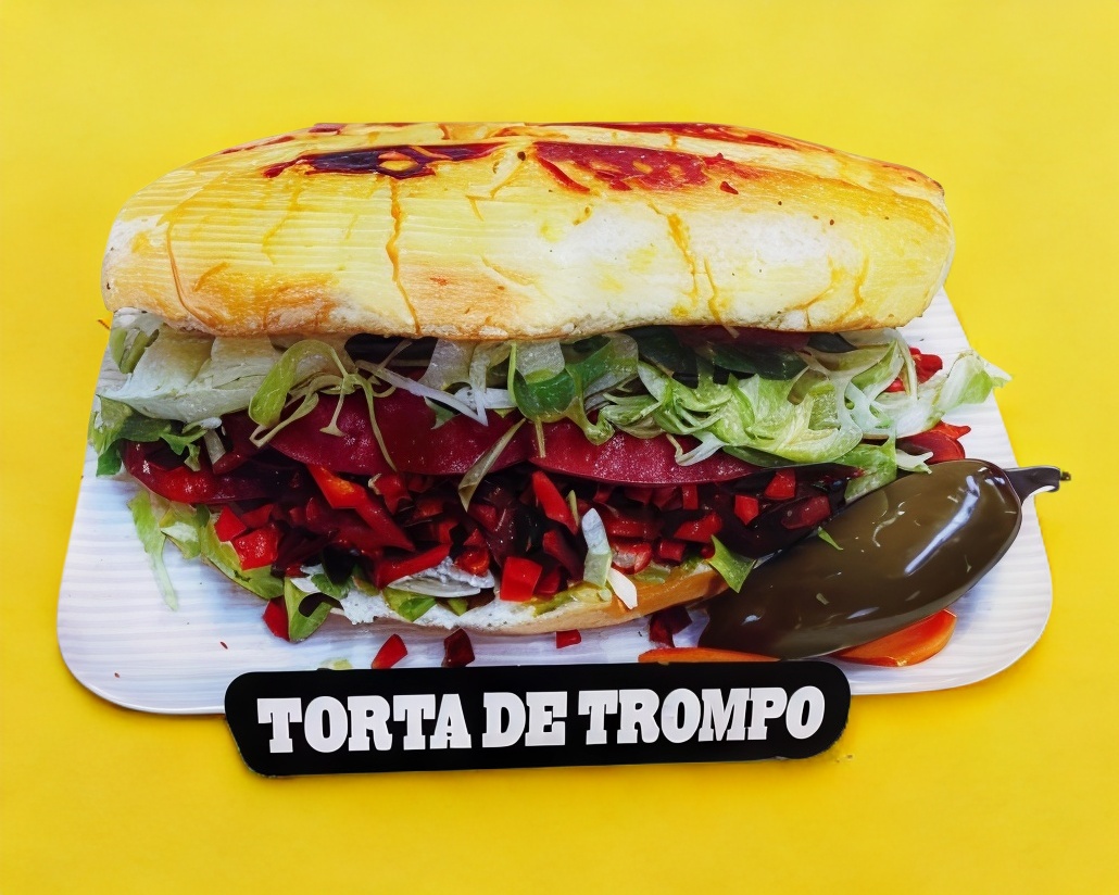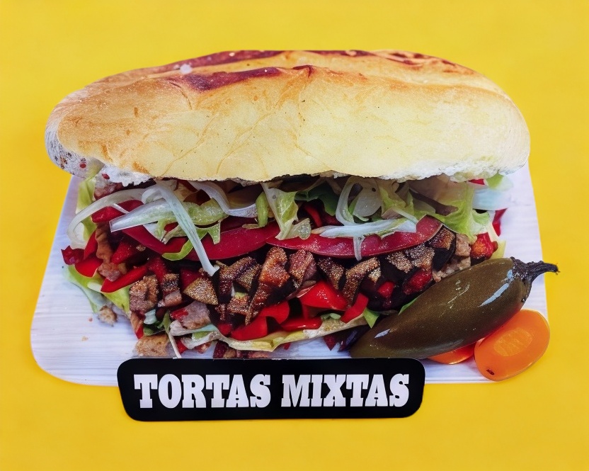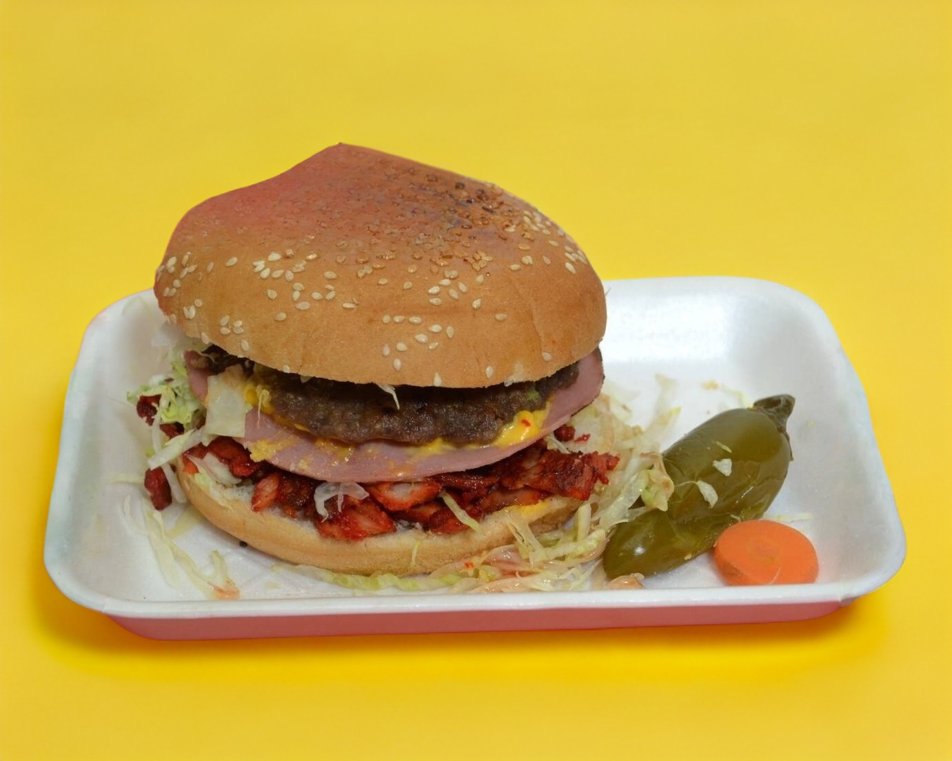 Carne de trompo, queso asadero, crema, jamón, lechuga, aguacate, tomate, cebolla, mayonesa y chile vinagre.