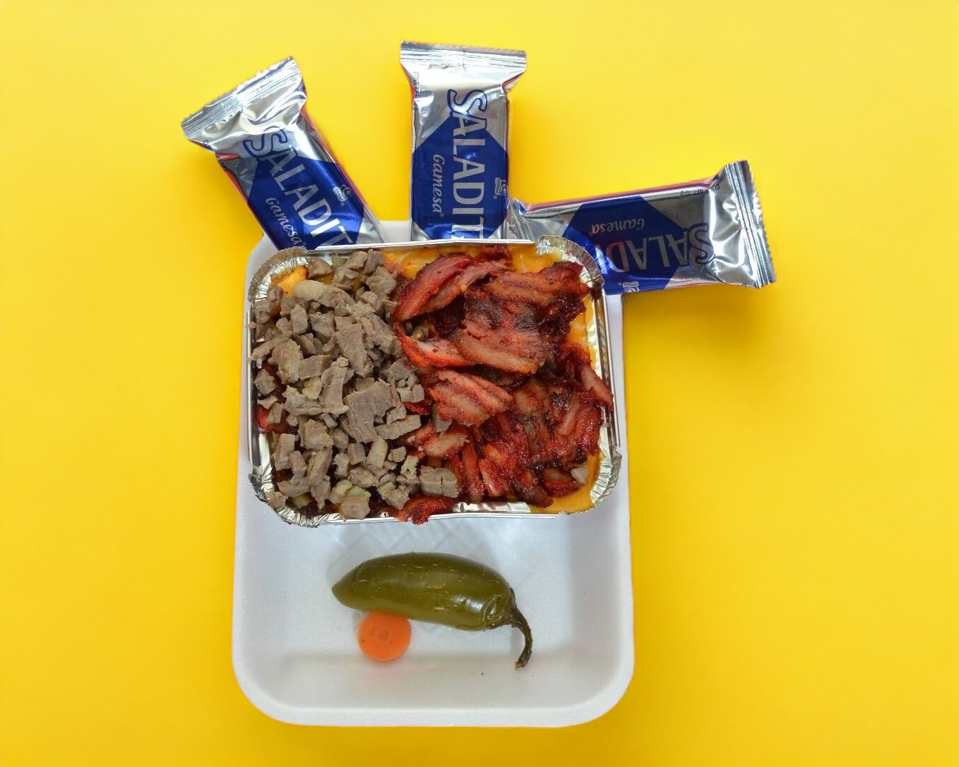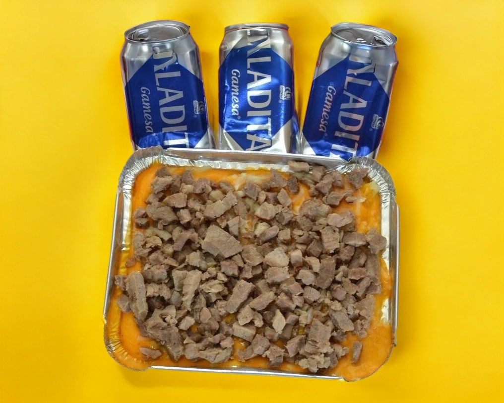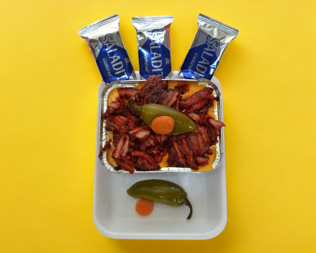 Carne de trompo, bistec, mantequilla, queso amarillo acompañado de saladitas salsa y chile vinagre.