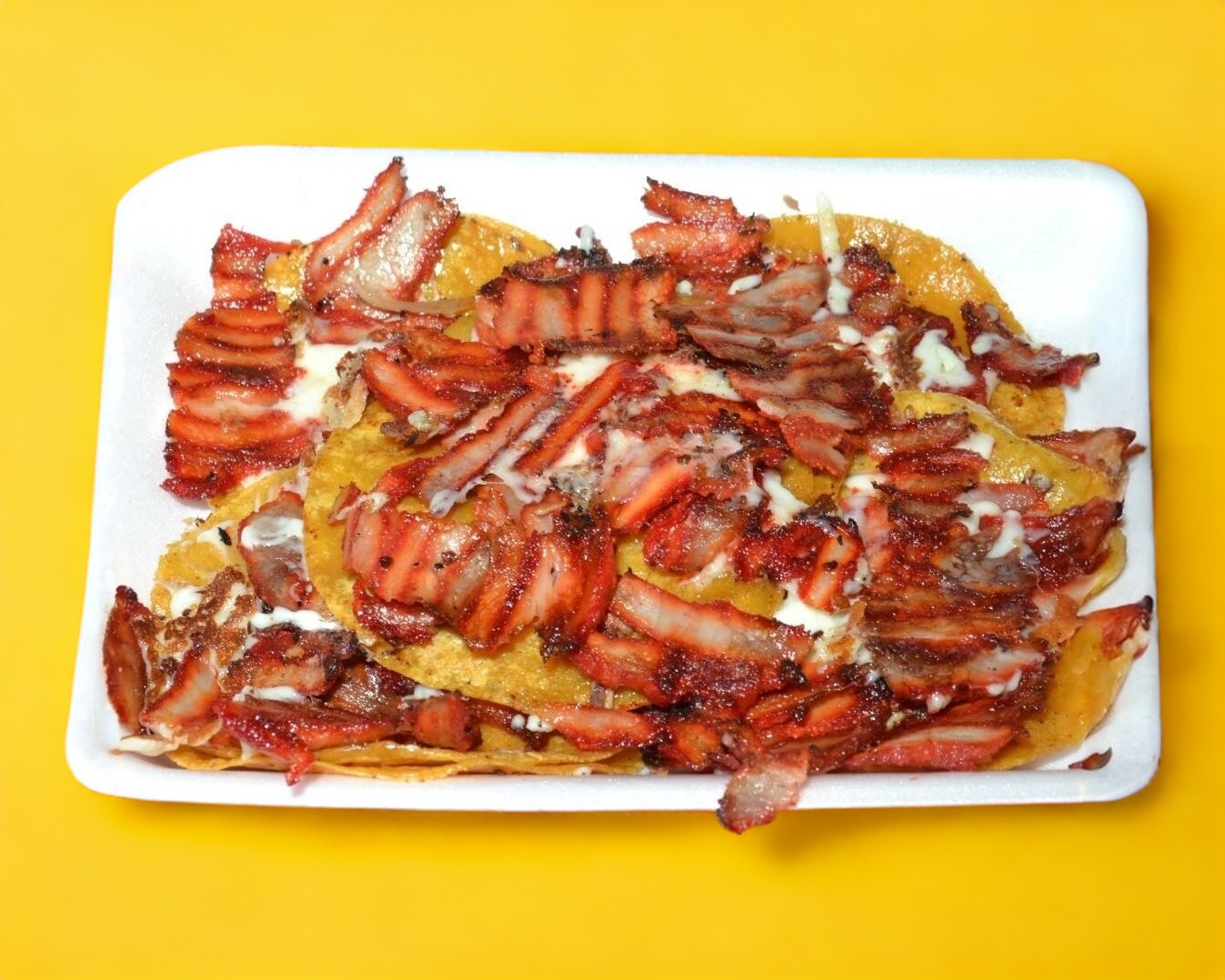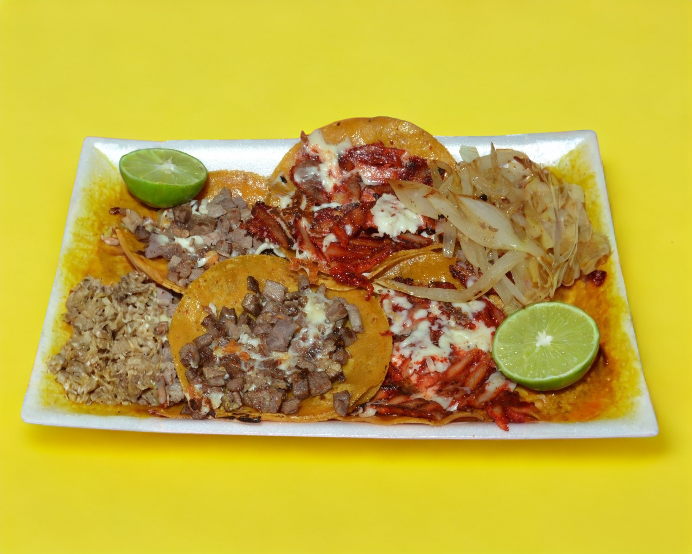 Tortilla de maíz, carne de trompo y bistec, queso asadero acompañado de su salsa cebolla cilandro y limón.