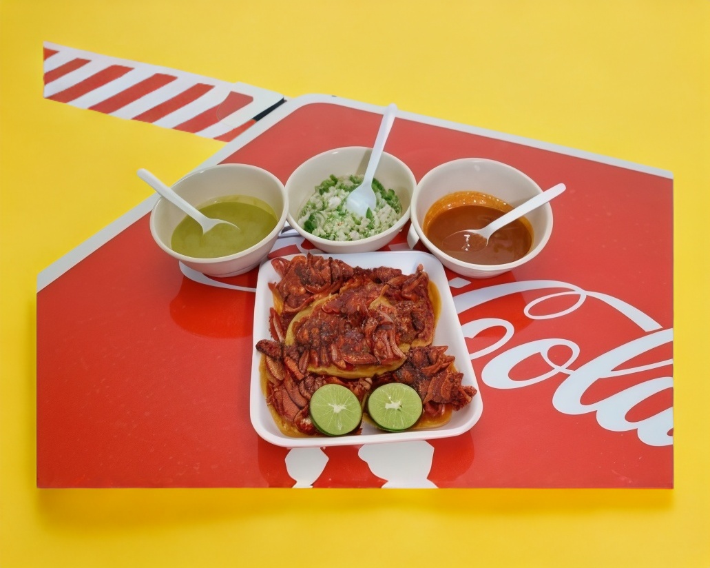 Carne de trompo con queso asadero acompañado de su salsa, limón, cilantro y cebolla.