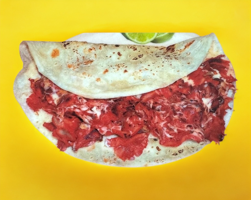Tortilla de harina con carne de trompo, bistec, queso asadero acompañado de su salsa cebolla cilandro y limón.