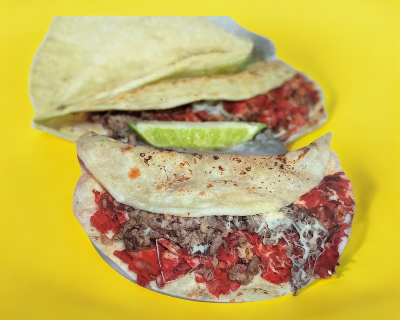 Tortilla de maíz, carne de bistec, queso asadero acompañado de su salsa cebolla cilandro y limón.