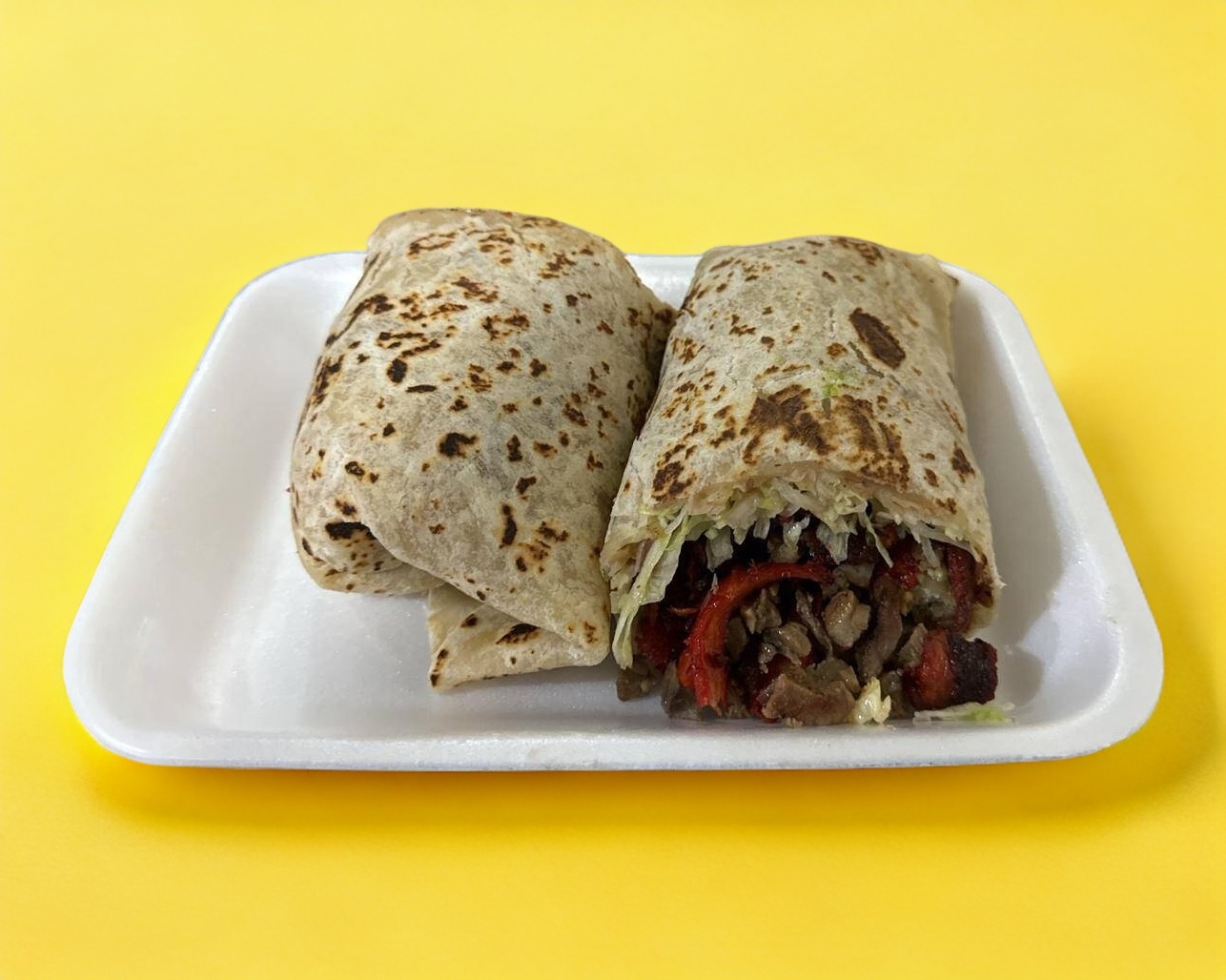 Tortilla de harina, carne de bistec, lechuga y aguacate.