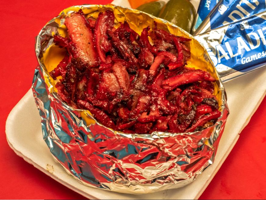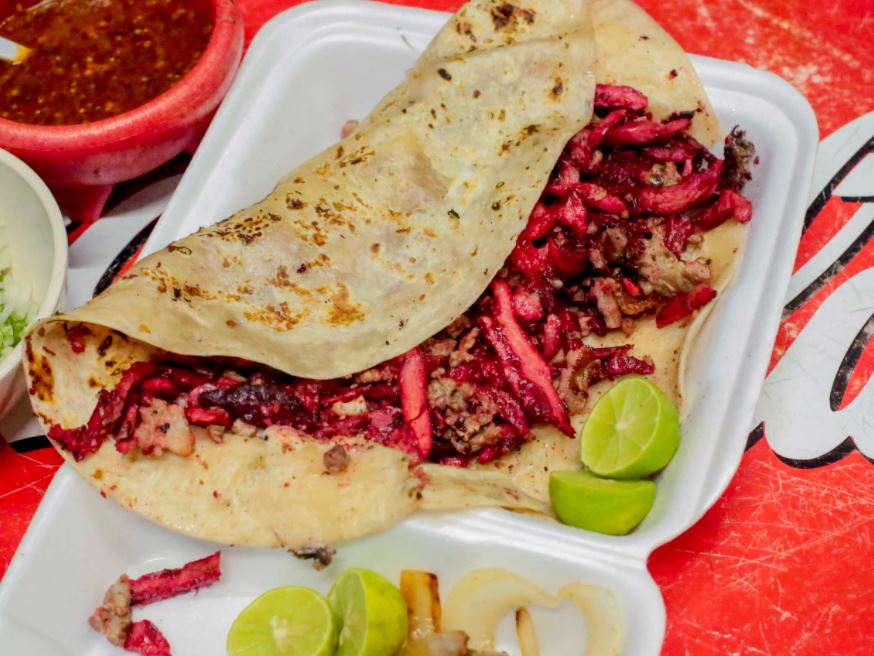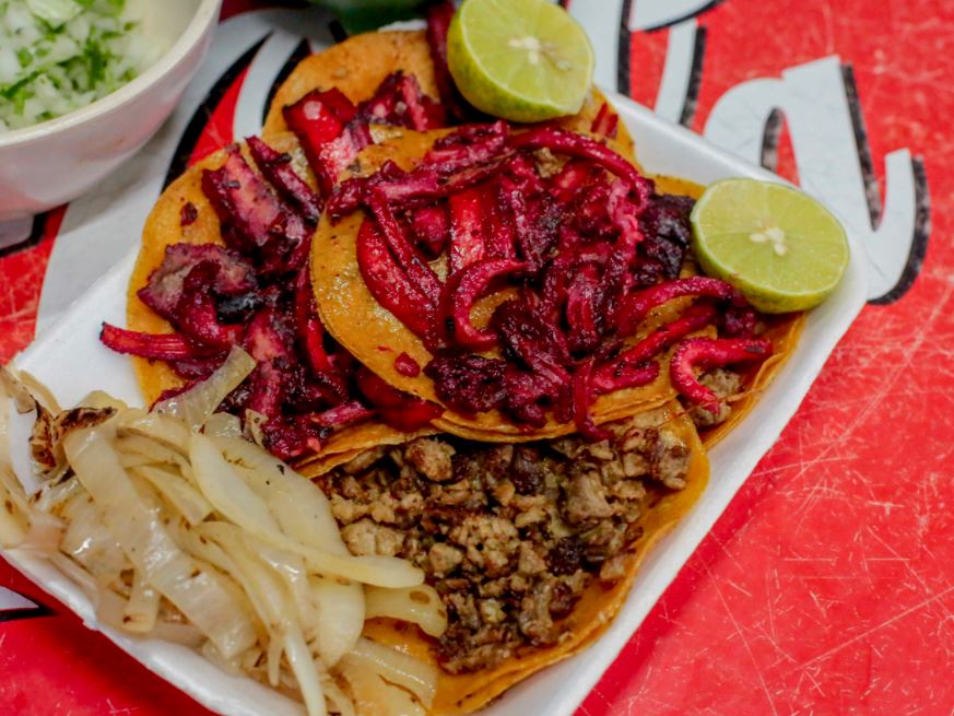 5 tacos de harina con carne mixta (trompo y bistec)