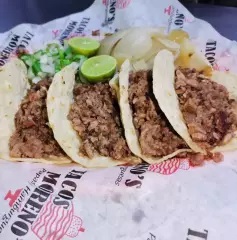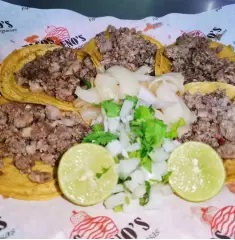 5 tacos de bistec acompañados de salsa limon cebolla y cilantro