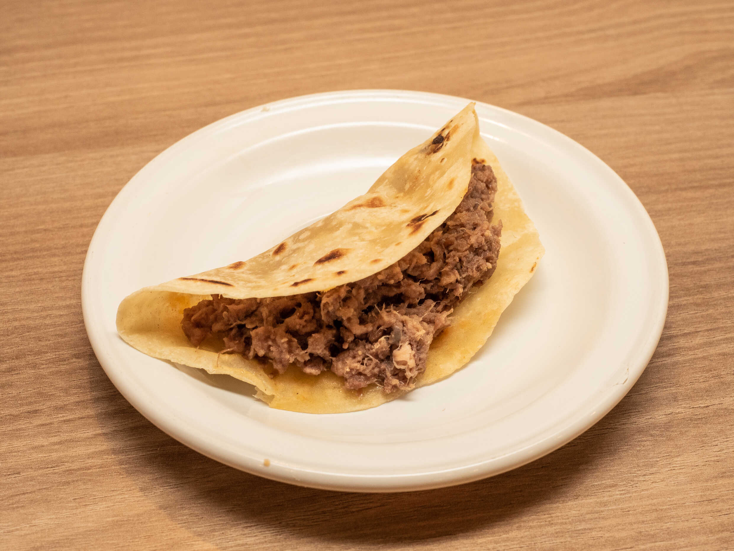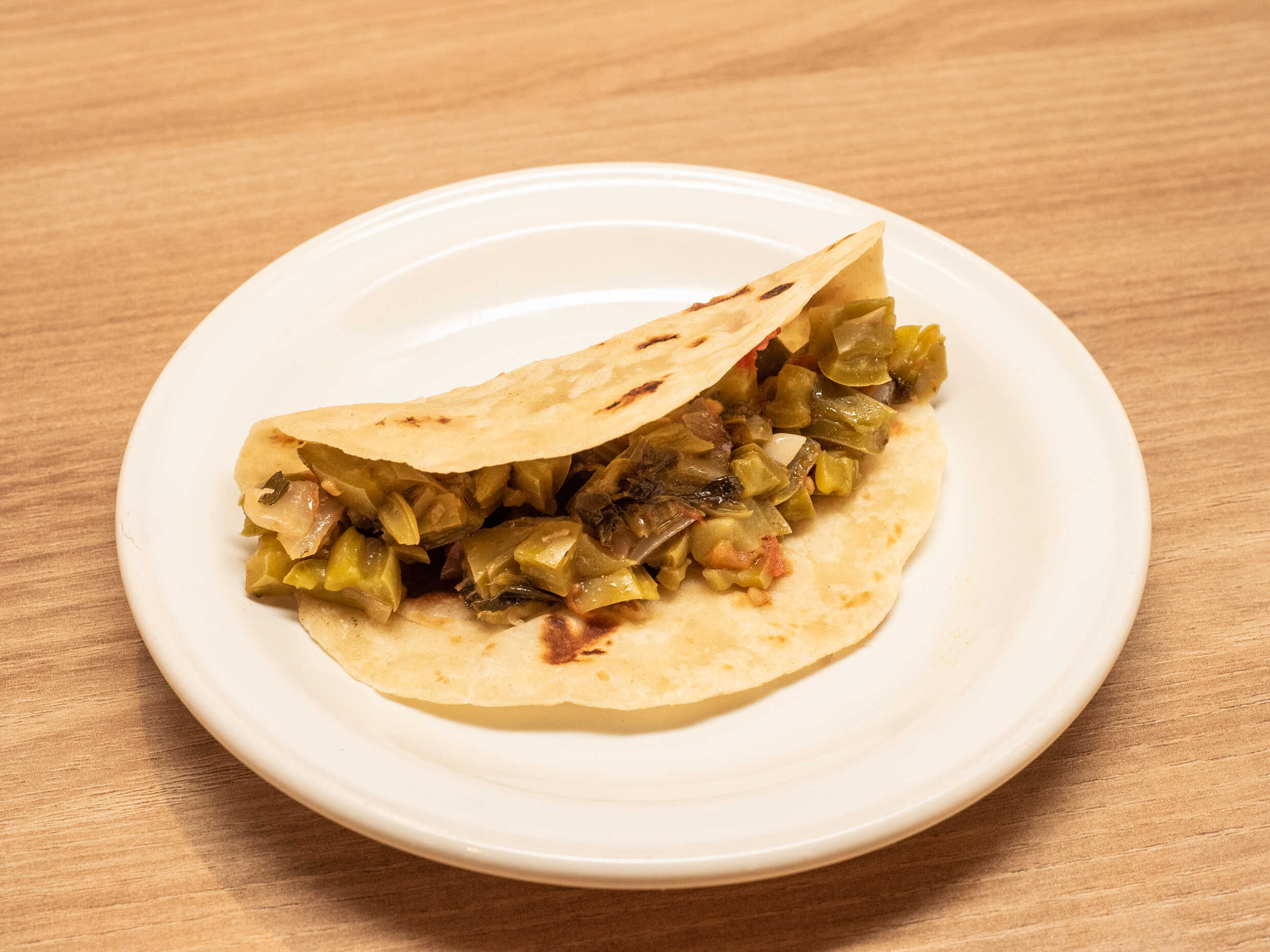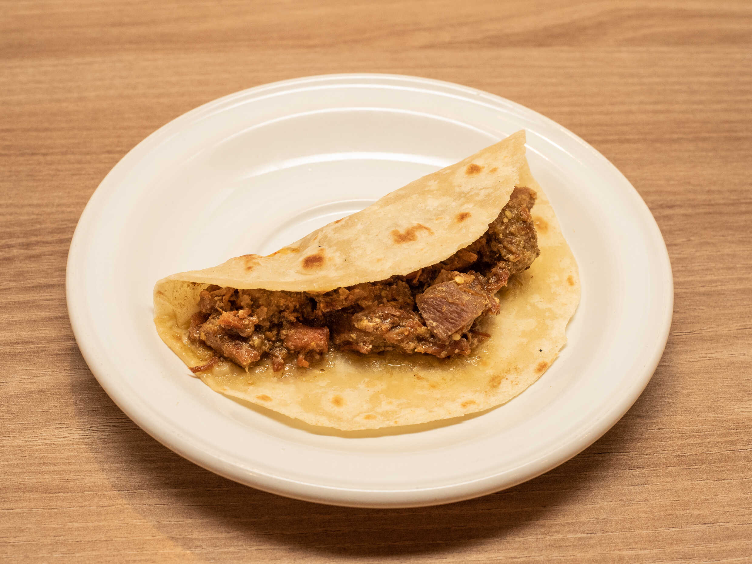 Taco de Carne Asada: tortilla de maíz o harina tipo 9, carne asada, verdura, cebolla asada, salsa, limón.