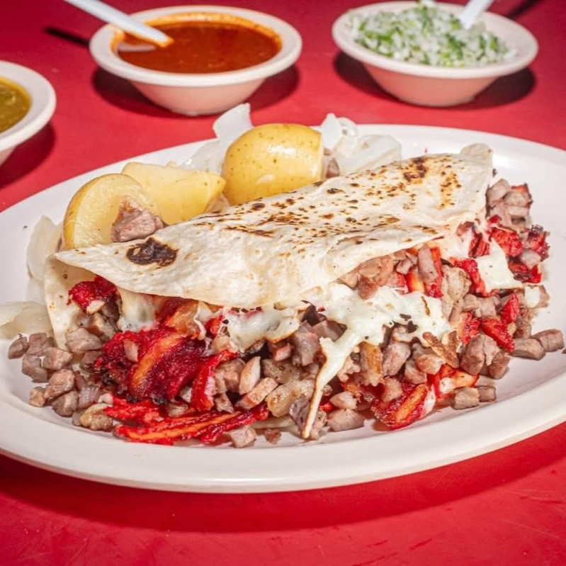 2 tortillas de harina, carne de trompo, queso asadero, salsa, cebolla y limón