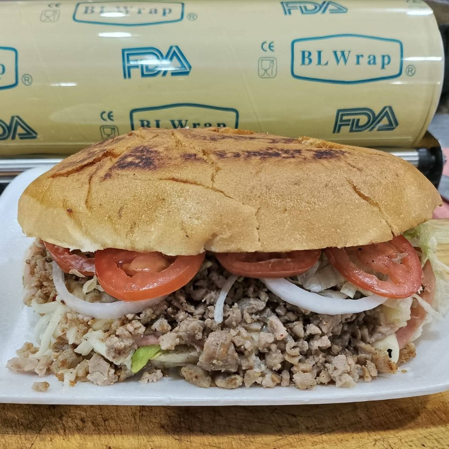 Pan, lechuga, mayonesa, aguacate, carne de trompo y bistec
