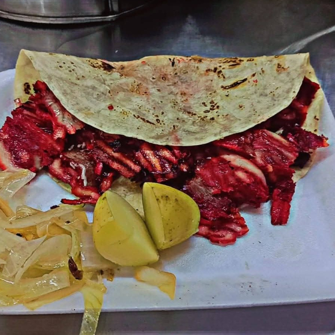 Una tortilla de harina con carne de trompo, queso asadero y aguacate, salsa, cebolla picada, limón y frijoles charros. Hasta agotar existencia.