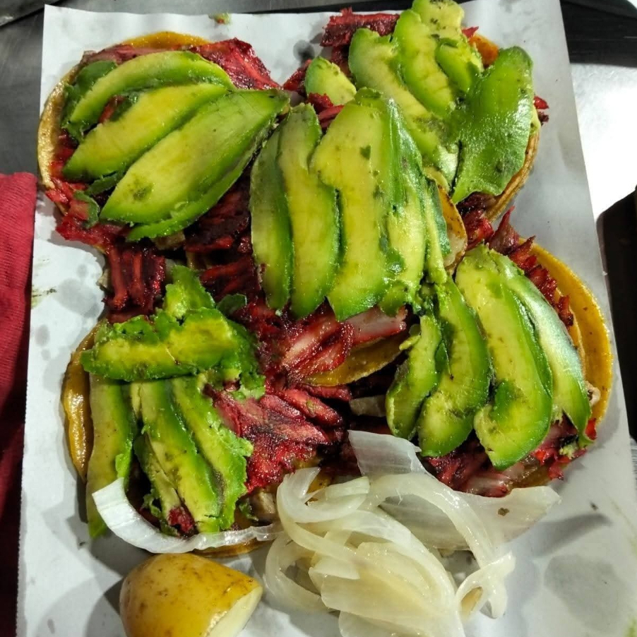 5 tacos en tortillas de maíz, aguacate, queso, salsa, cebolla y limón