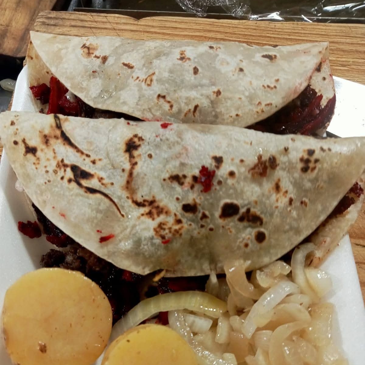 2 tortillas de harina, carne de bistec, salsa, cebolla y limón