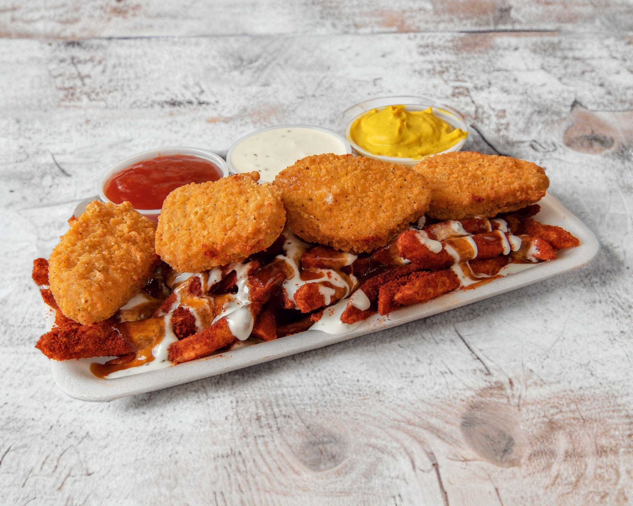 Papas a la francesa preparadas con queso amarillo y carne de trompo, bistec o mixta.