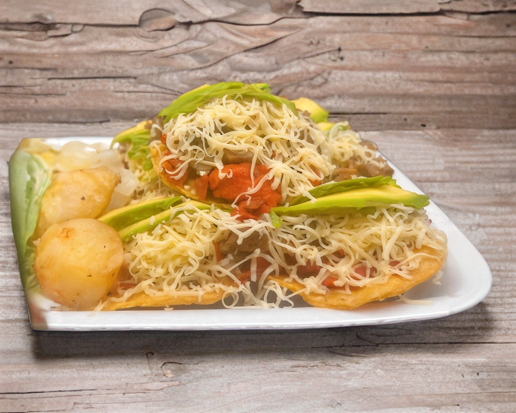 Platillo individual: una tortilla de harina de 24 cm con queso, carne de trompo, bistec y aguacate.