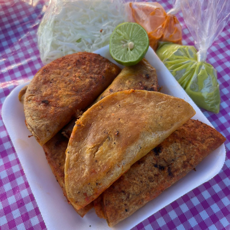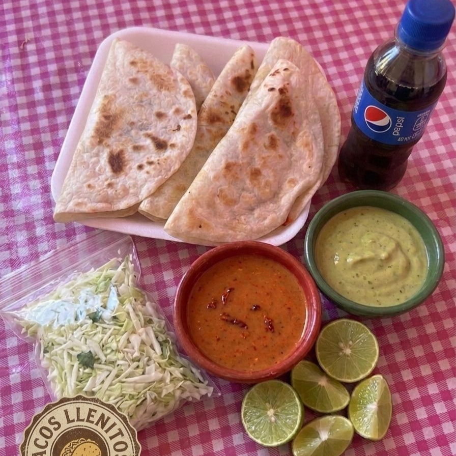 5 Tacos de maíz naturales o con adobo ,acompañados de su rica salsa roja o verde ,limon,repollo y cuernitos.