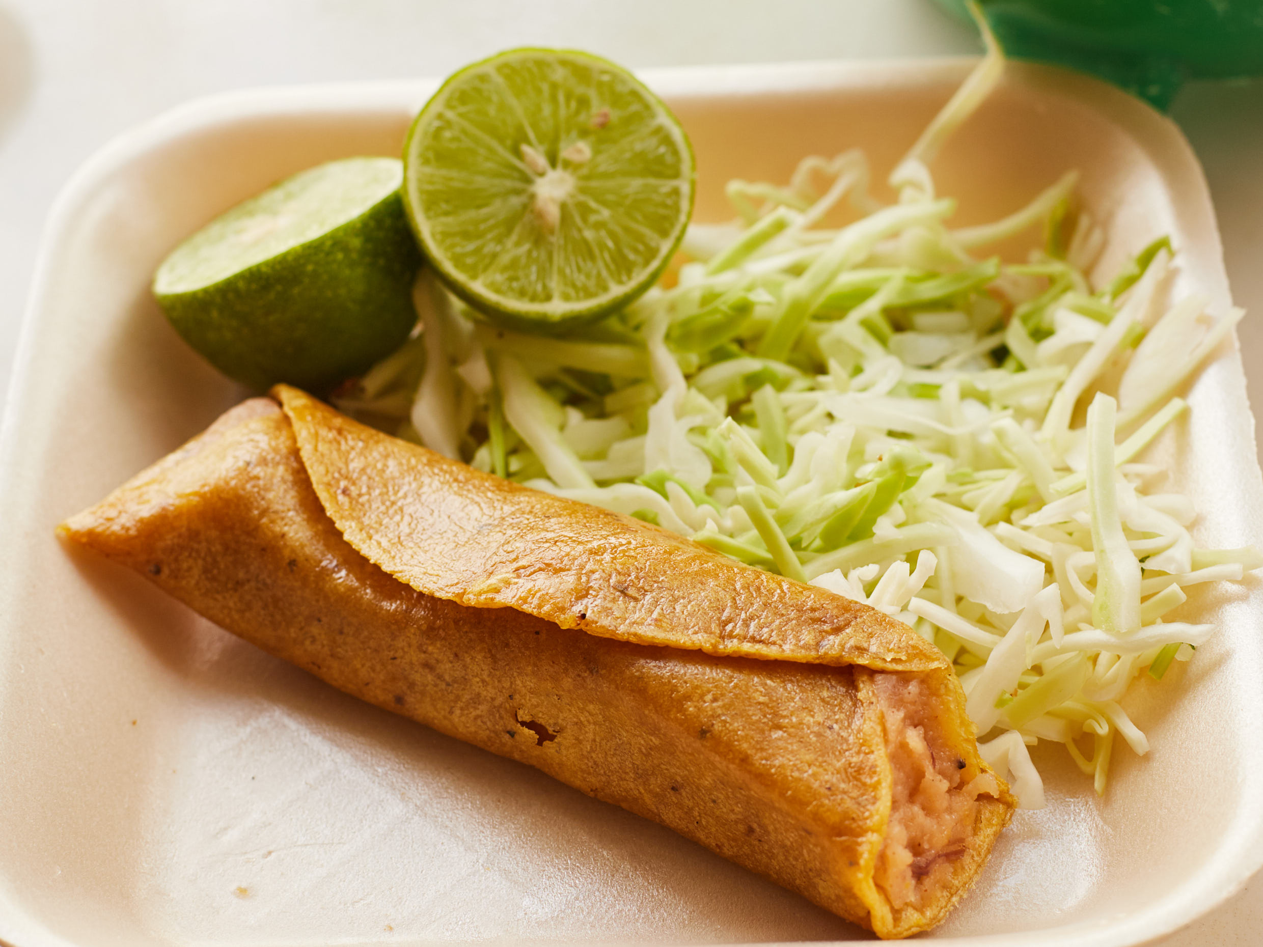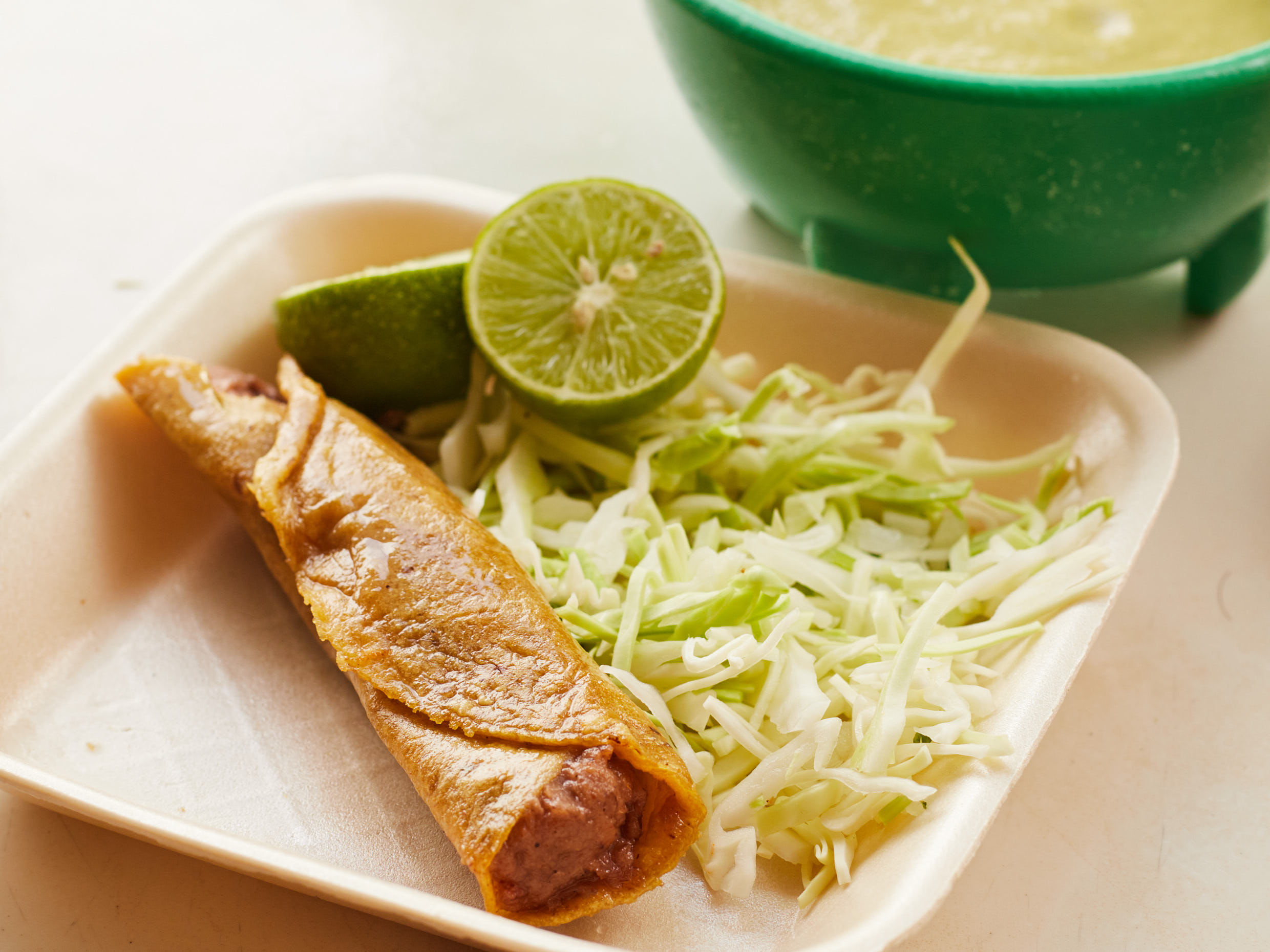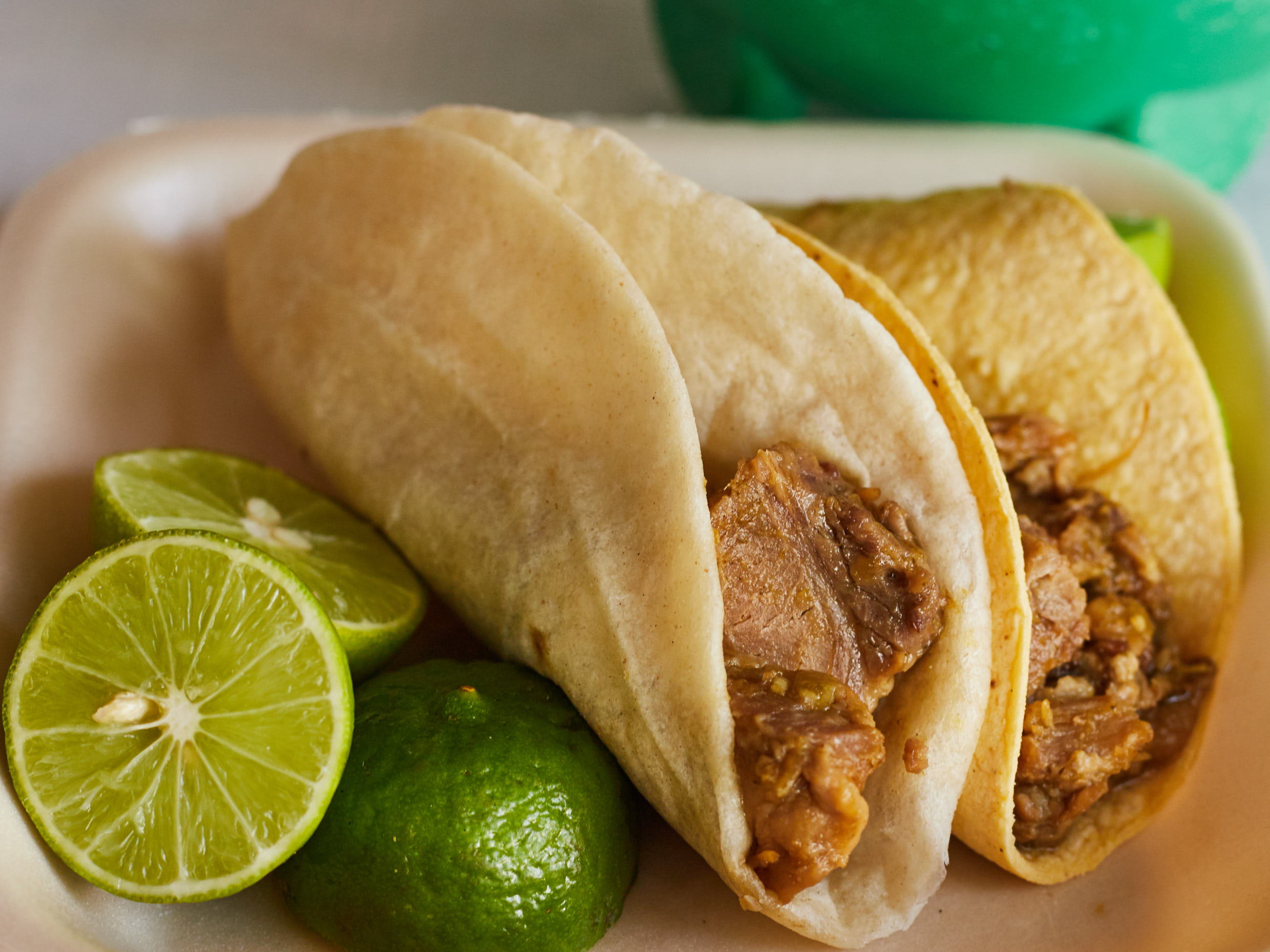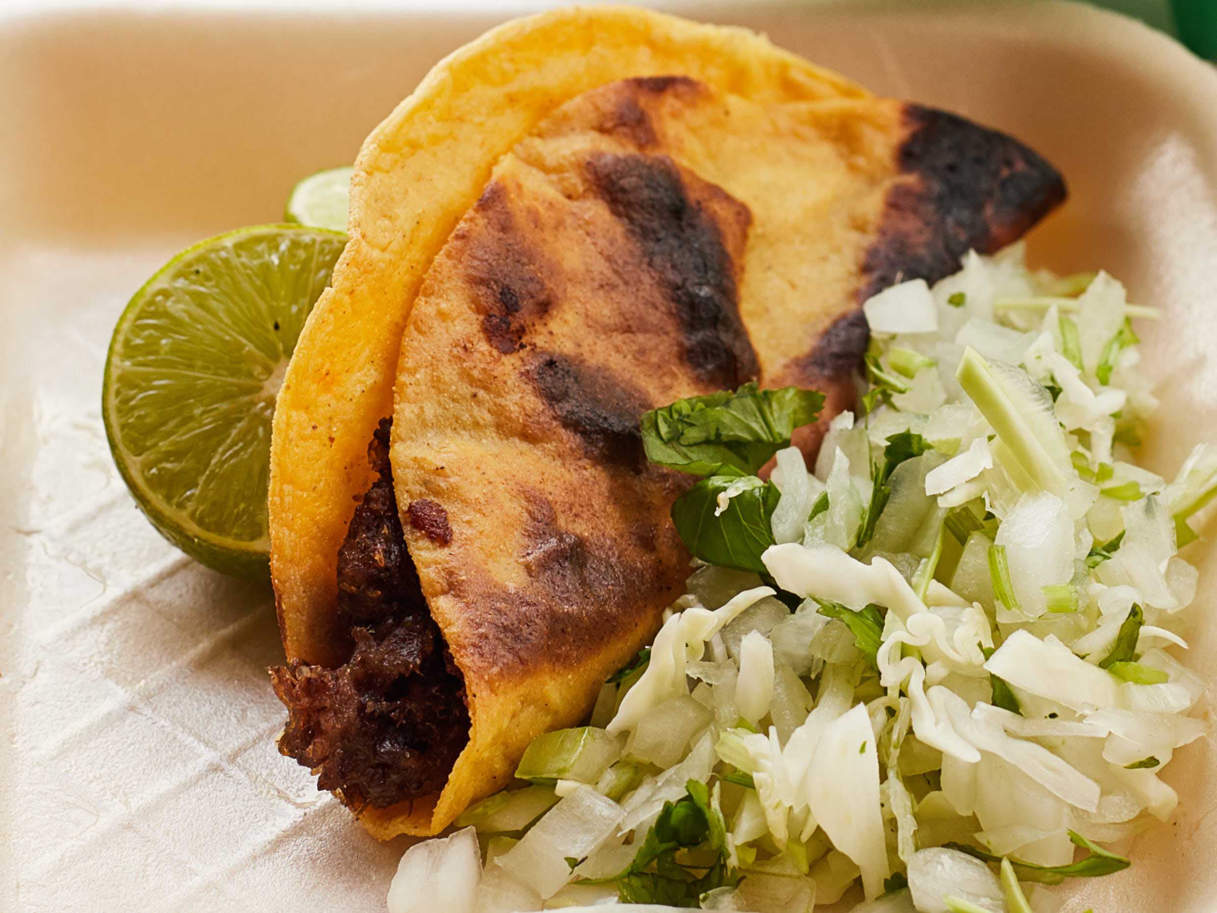 Elige harina o maíz, incluye salsa verde, repollo y limón.