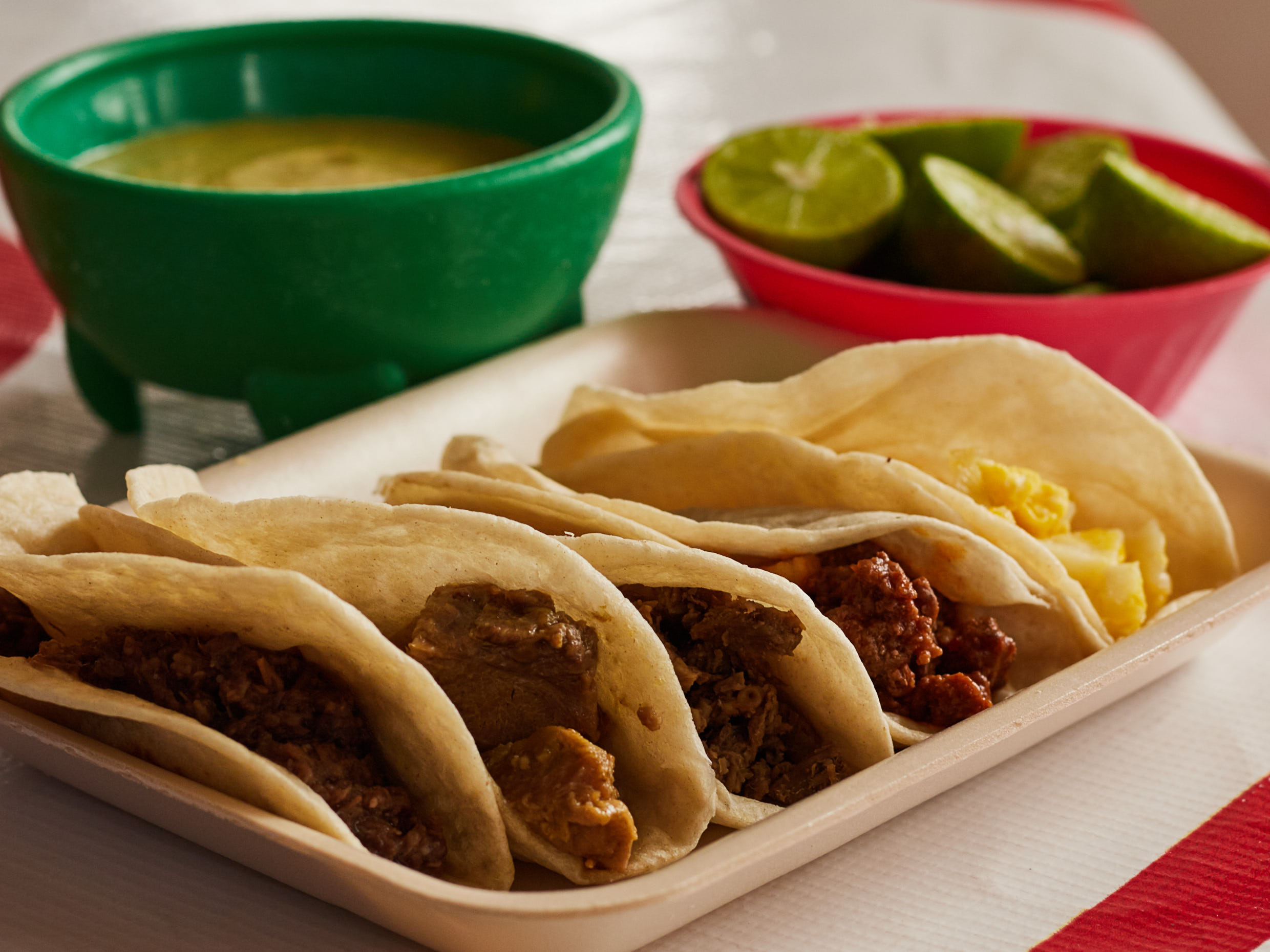 Elige harina o maíz, incluye salsa verde, limón, cebolla picada y cilantro.