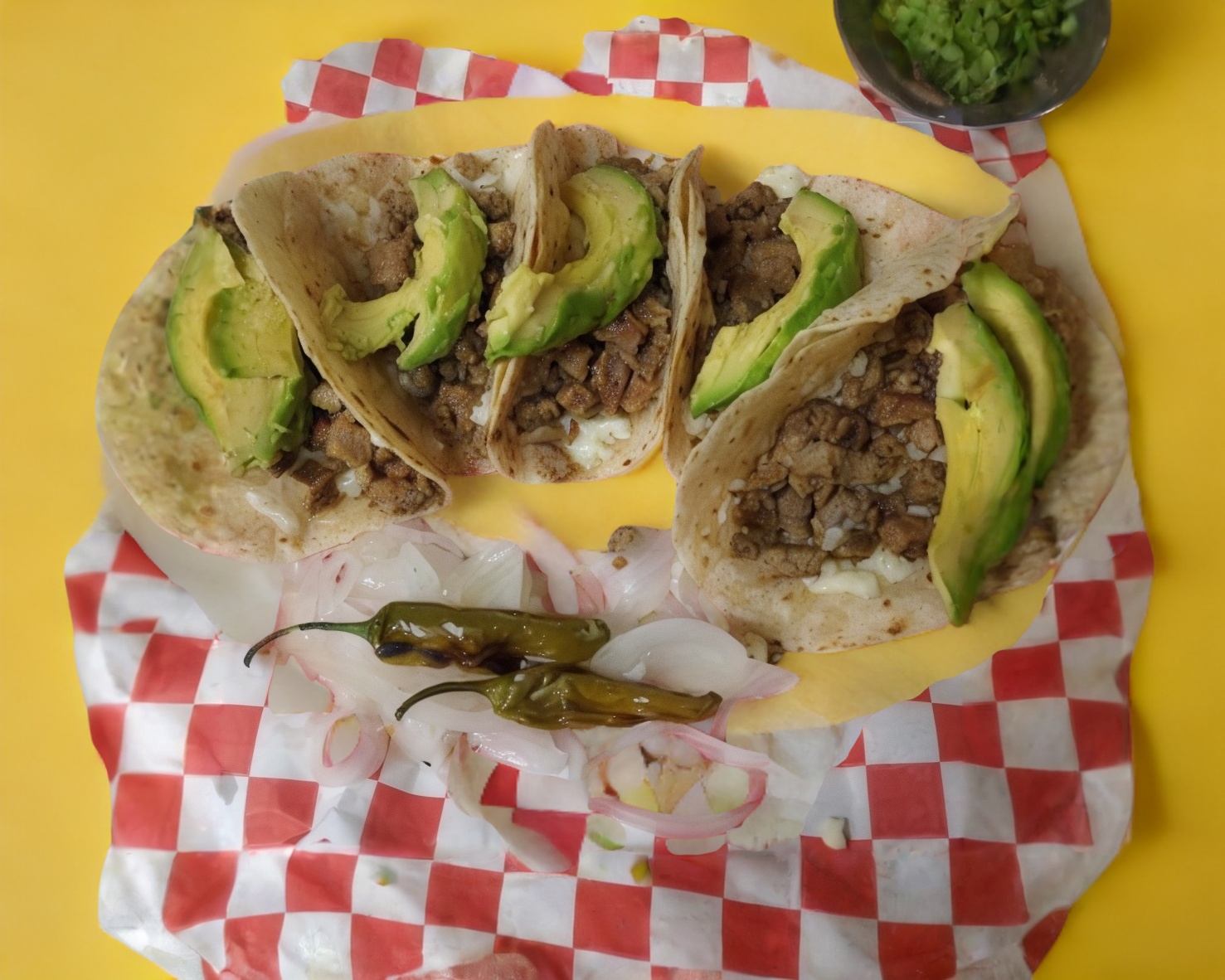 5 tacos en tortilla de harina con queso asadero aguacate y carne asada incluye: pico de gallo, cebolla asada,limón y salsa verde