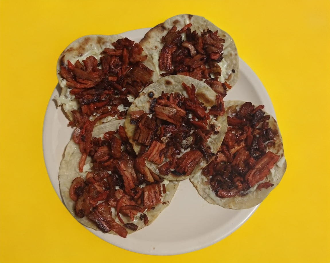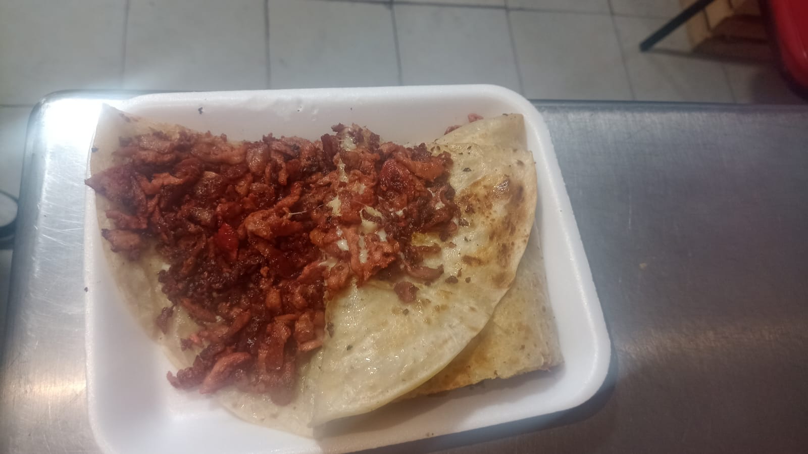 Orden de Gringitas con Queso Asadero, con Carne de Trompo, incluye salsa verde, cebolla asada, limón y cebolla con cilantro.