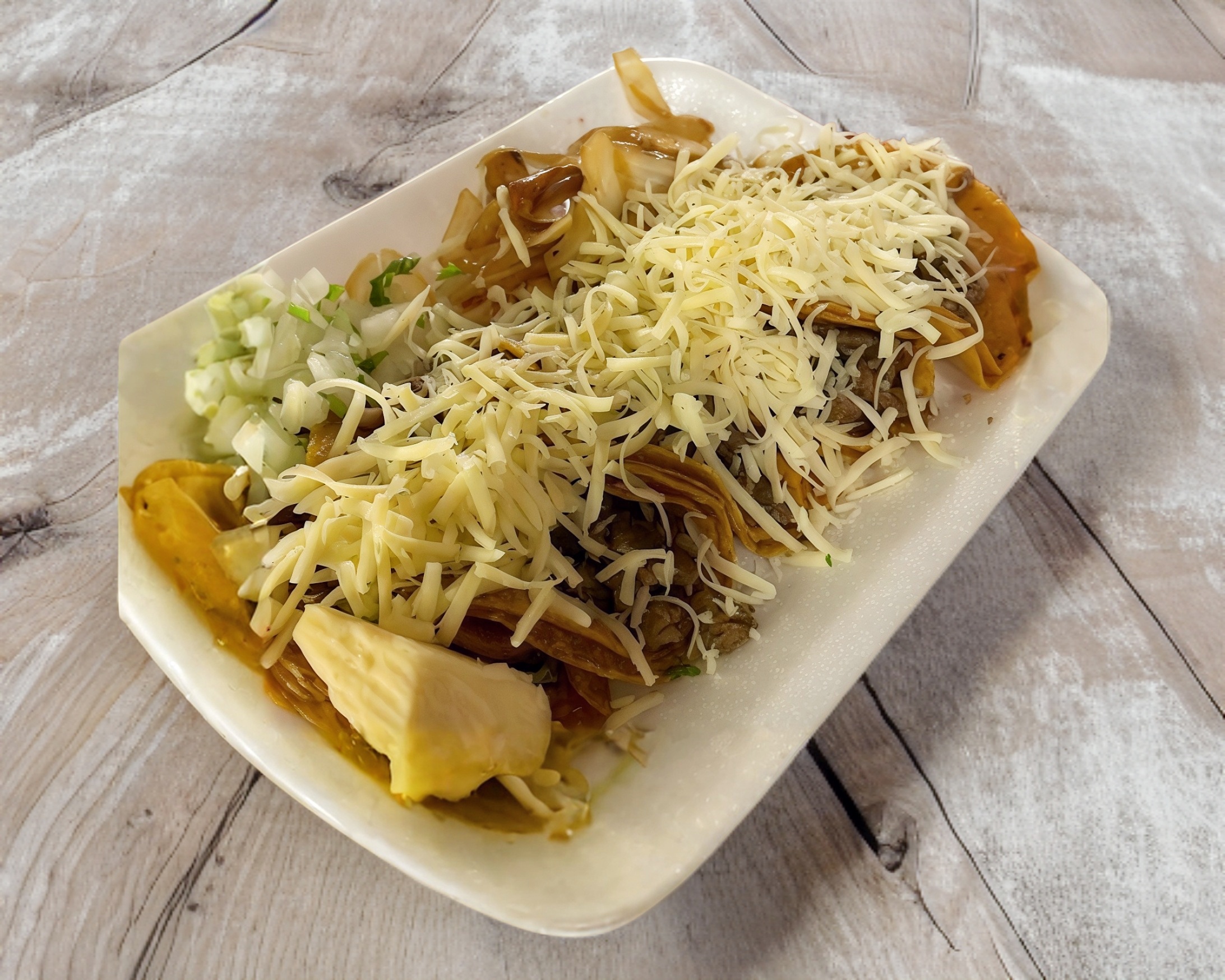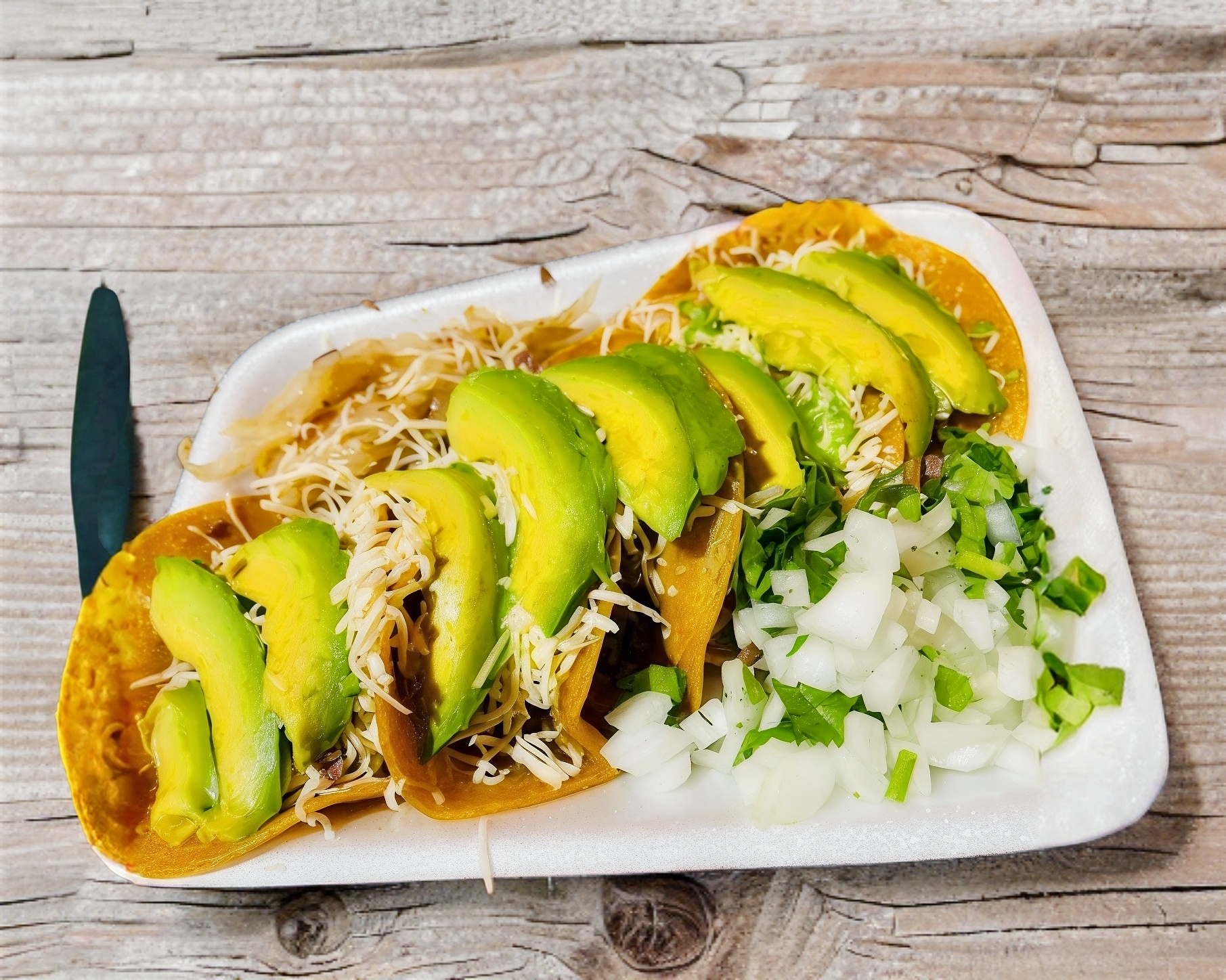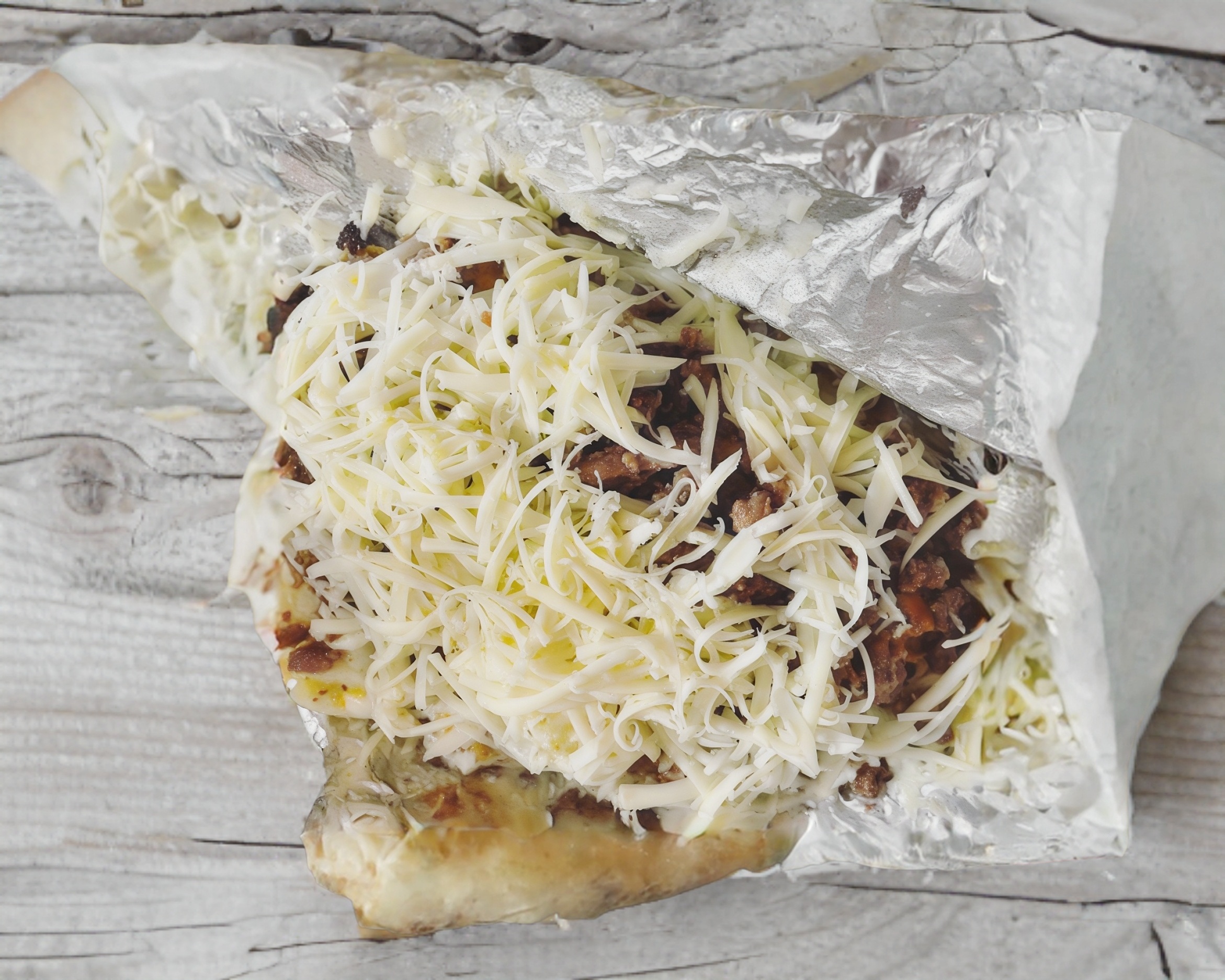 Tortilla de harina con quesos, jamón y porción de carne de trompo.