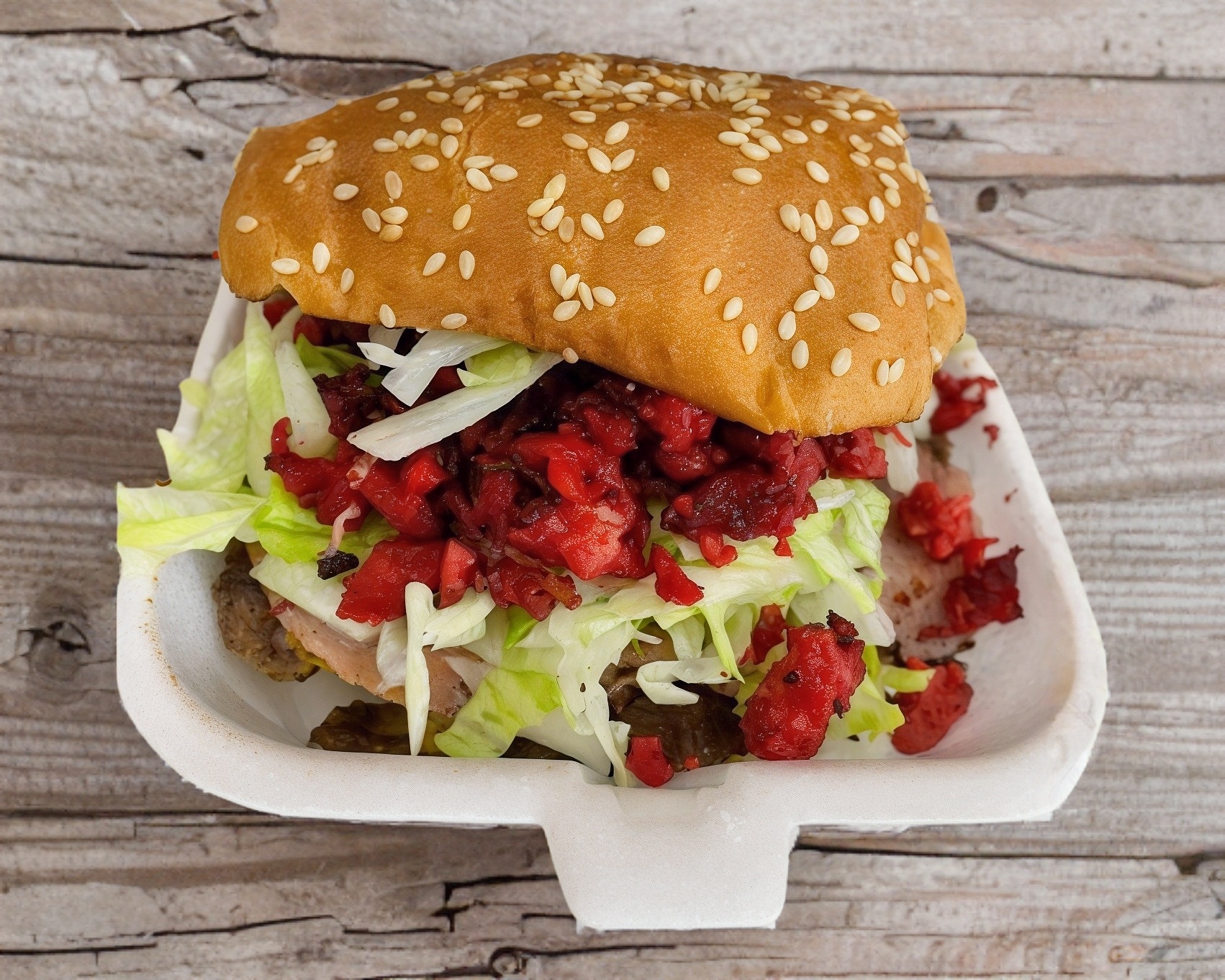 Doble tortilla de harina con quesos, jamón y carne de puerco y bistec