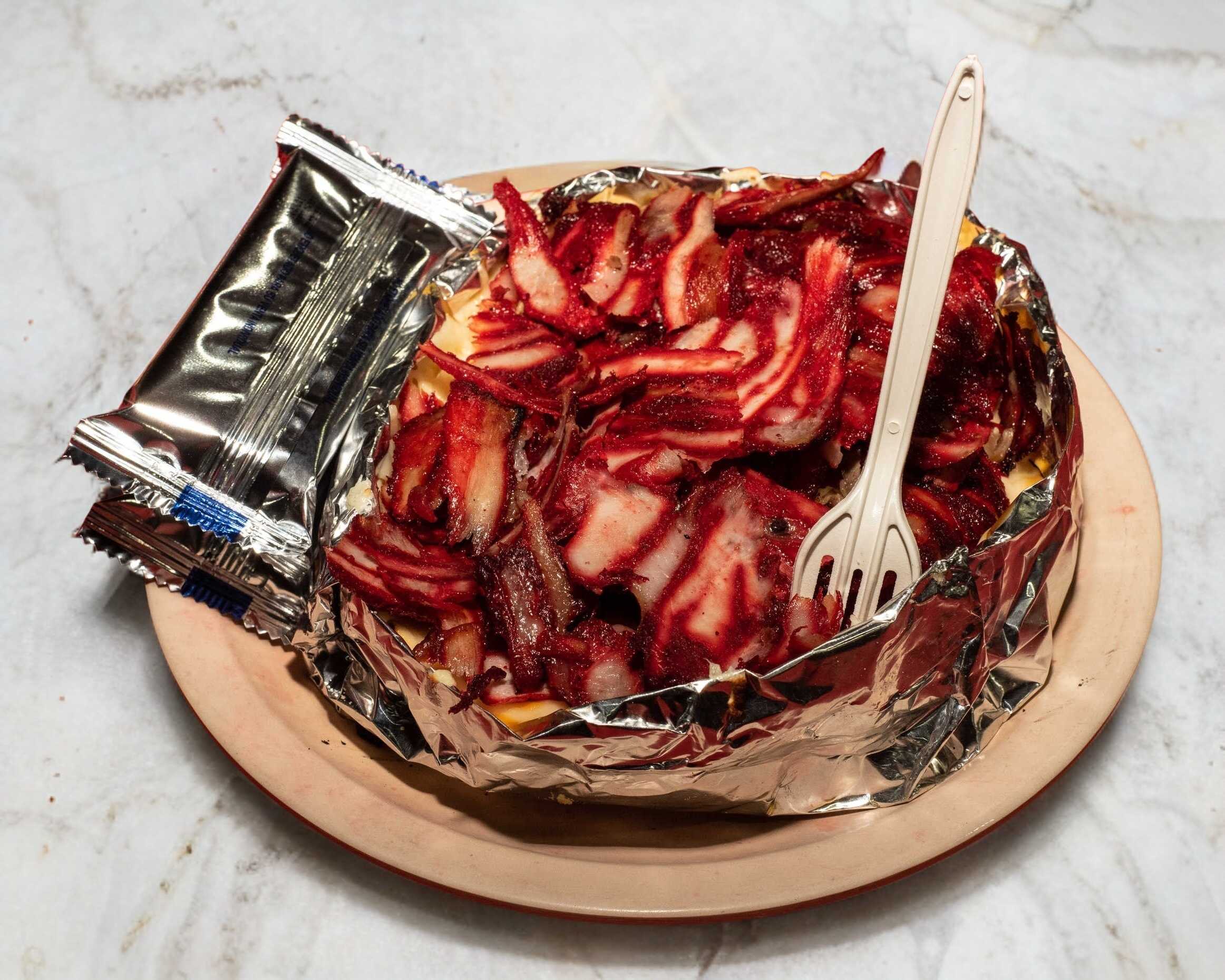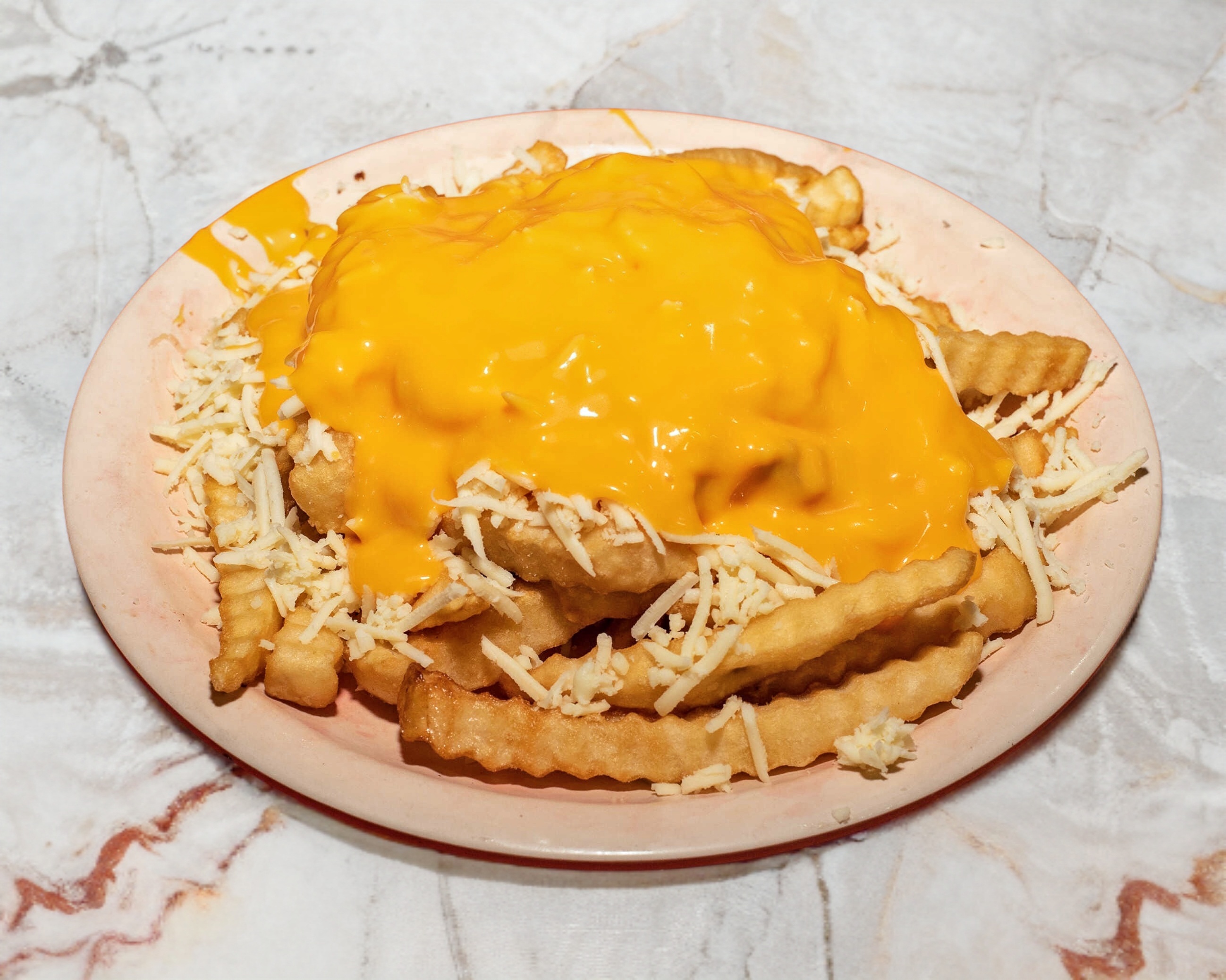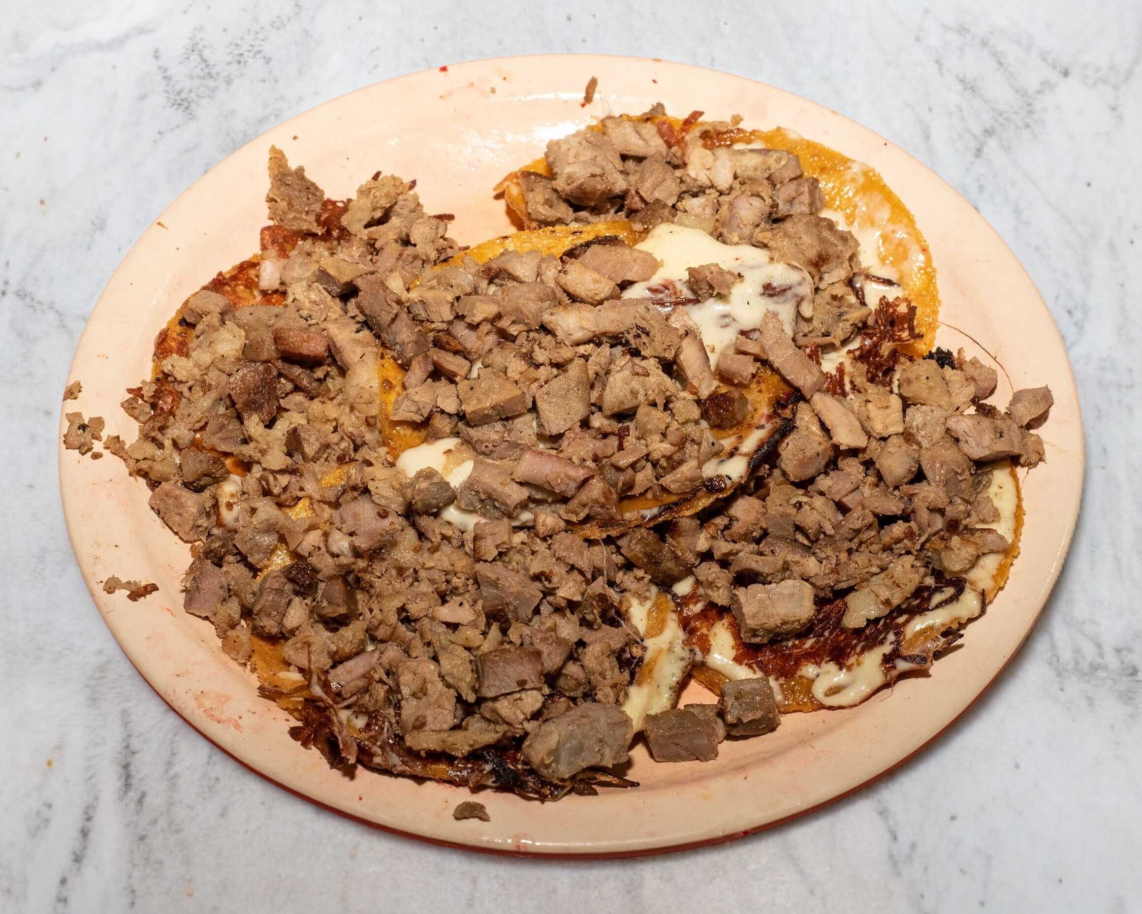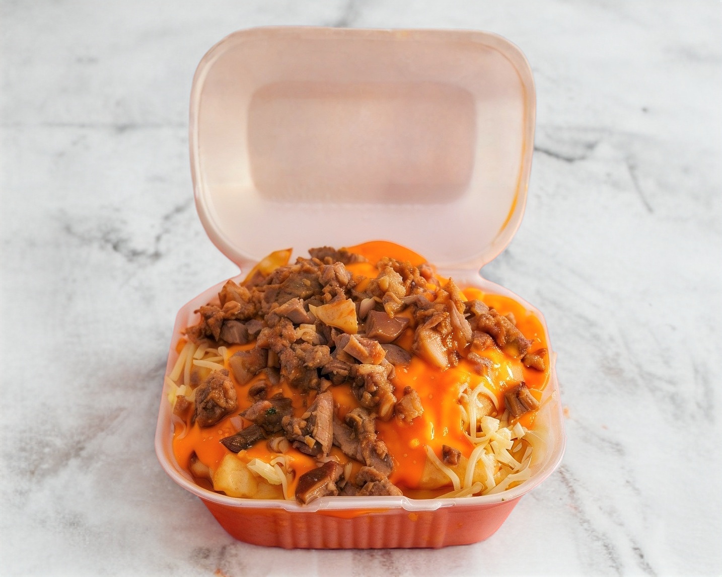 Papas a la francesa con aderezo de queso amarillo, queso blanco y carne de bistec