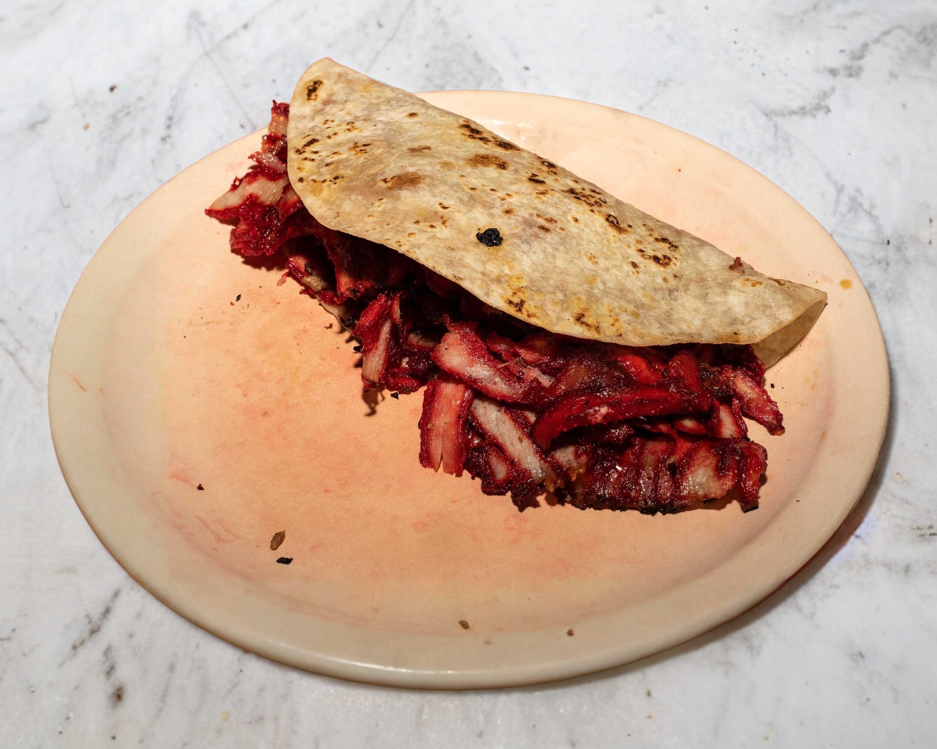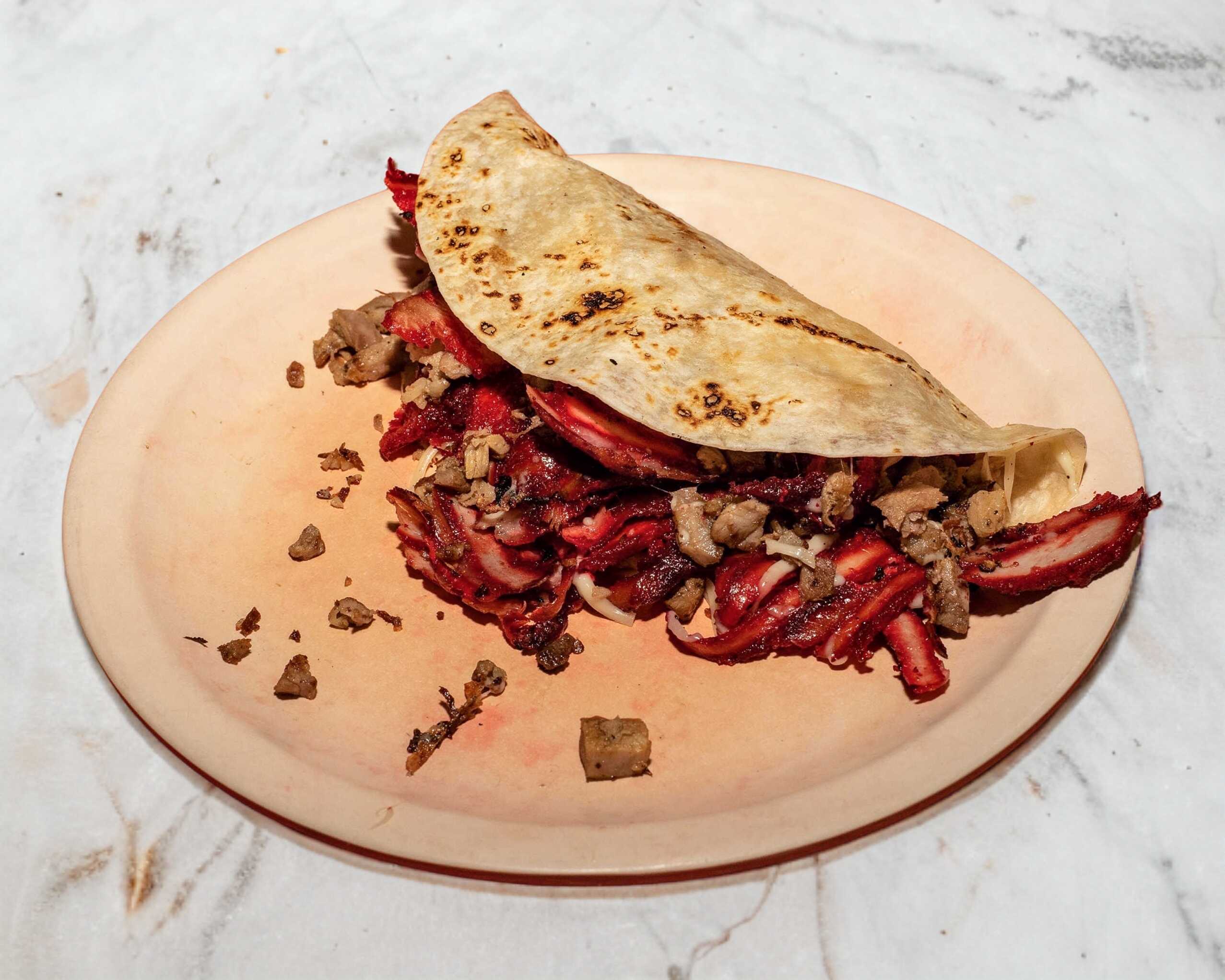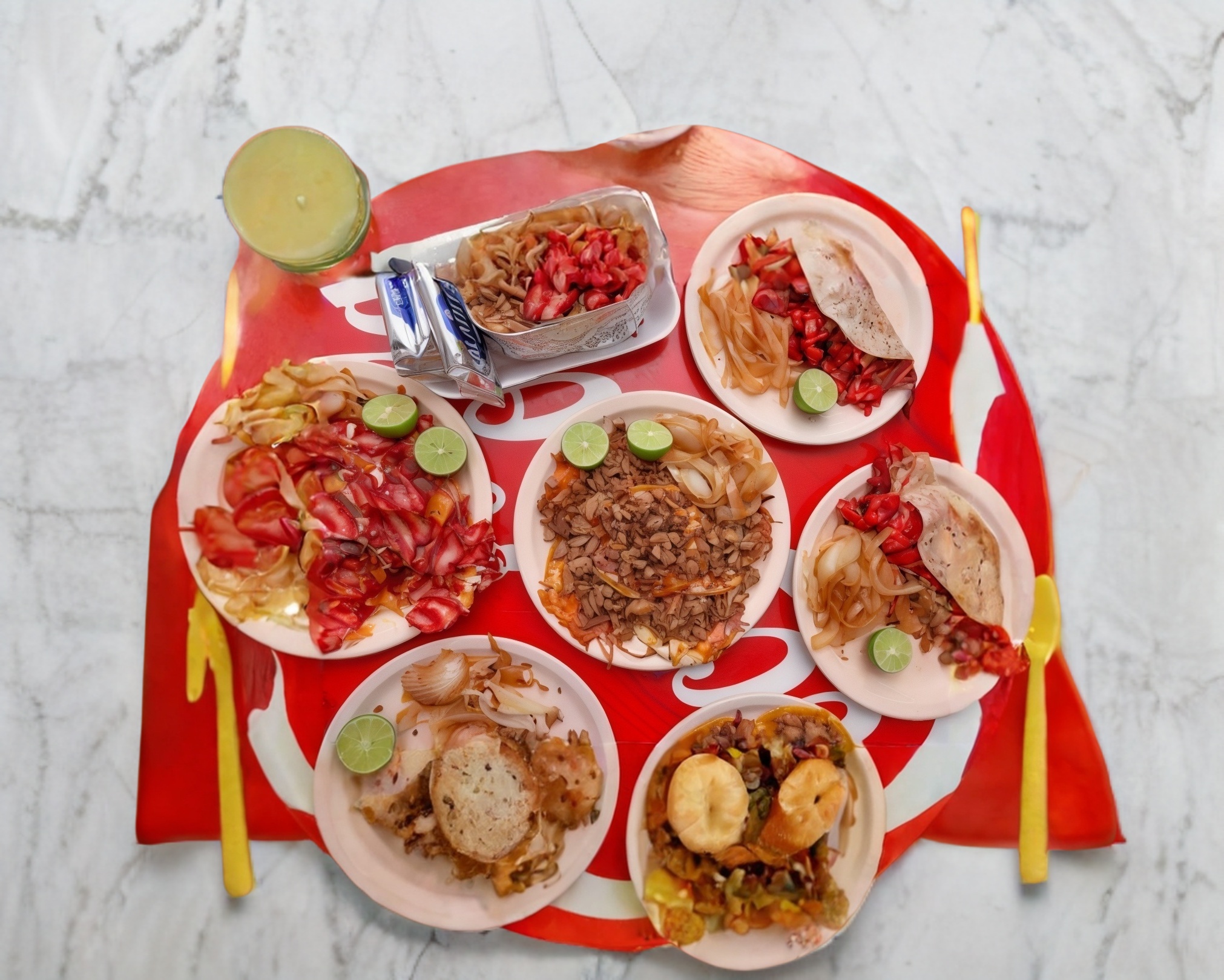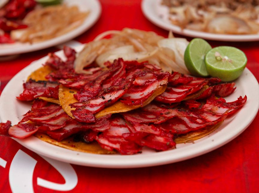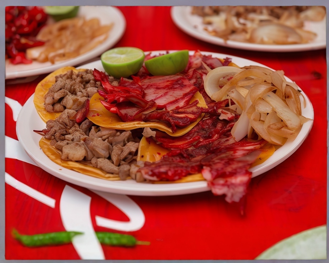Carne de res, carne de trompo y bistec, mayonesa, mostaza, cátsup, tomate, cebolla, lechuga, aguacate, jamón, quesos blanco y amarillo.
