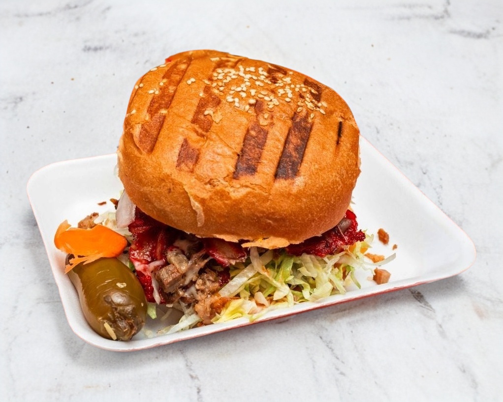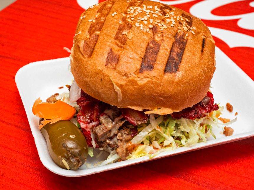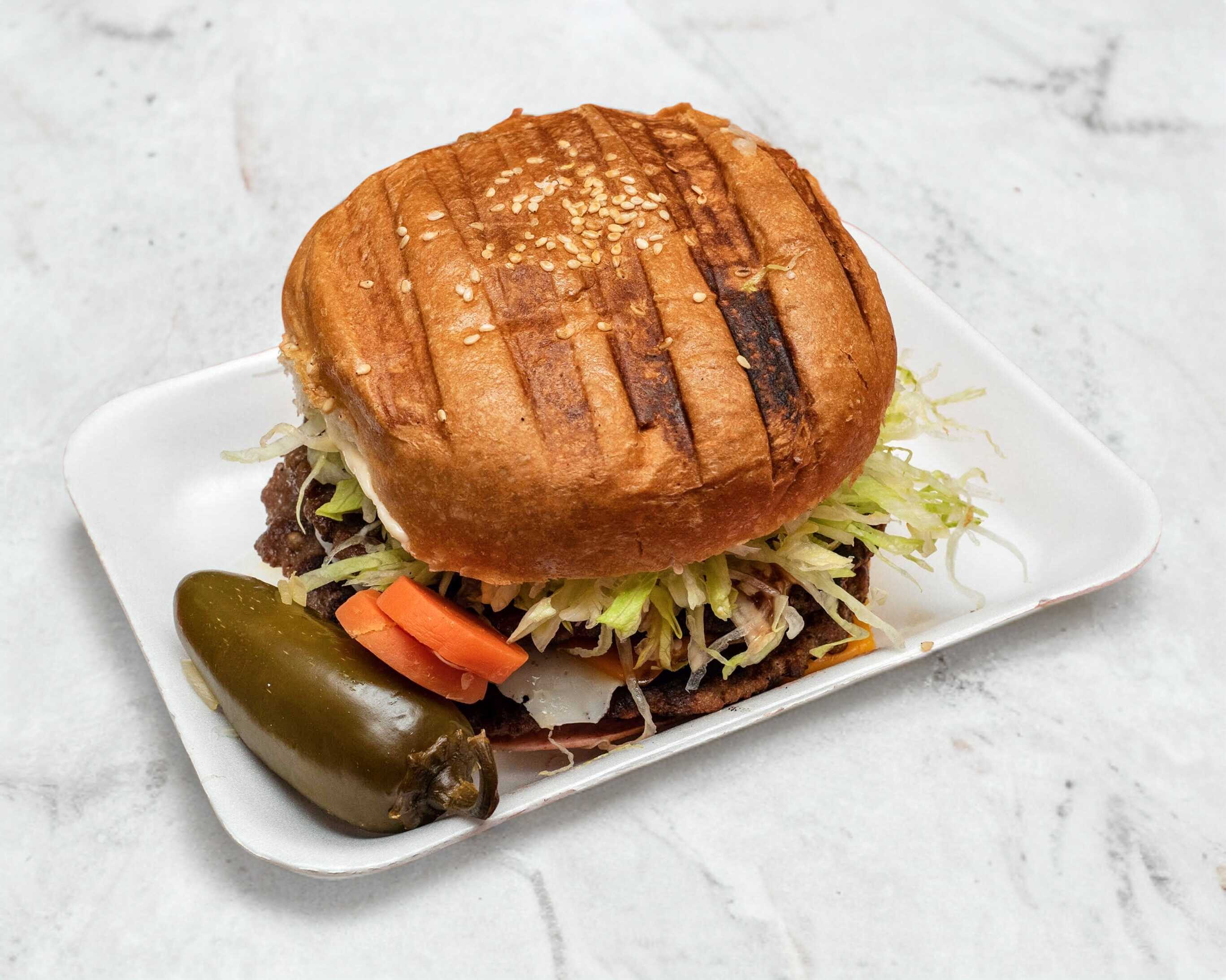 Con doble carne de res, mayonesa, mostaza, cátsup, tomate, cebolla, lechuga, aguacate, jamón, quesos blanco y amarillo.