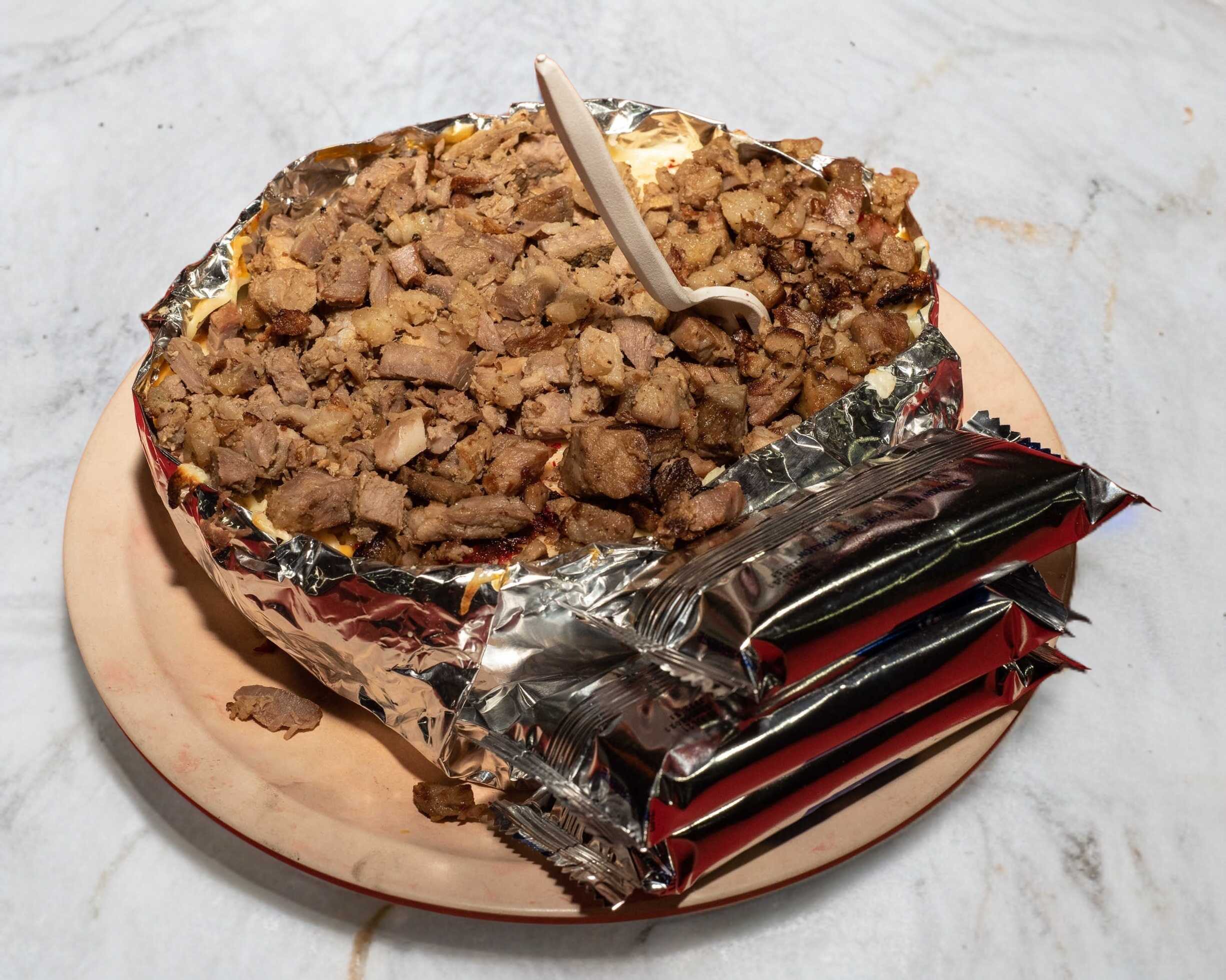 Papa asada al carbón, mantequilla, aderezo de queso amarillo, queso asadero y carne asada o carne de trompo.