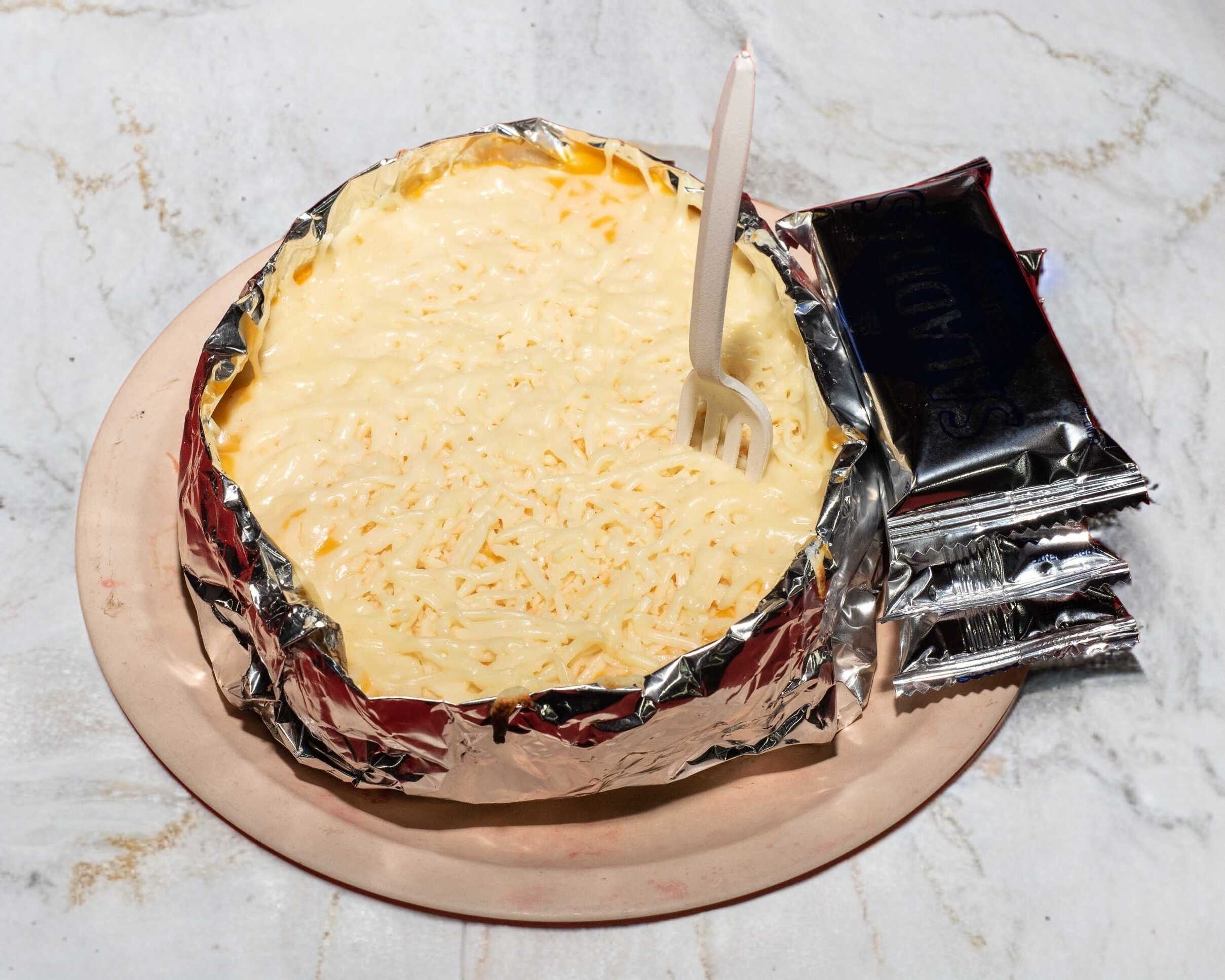 Papa asada al carbón, mantequilla, aderezo de queso amarillo y queso asadero.