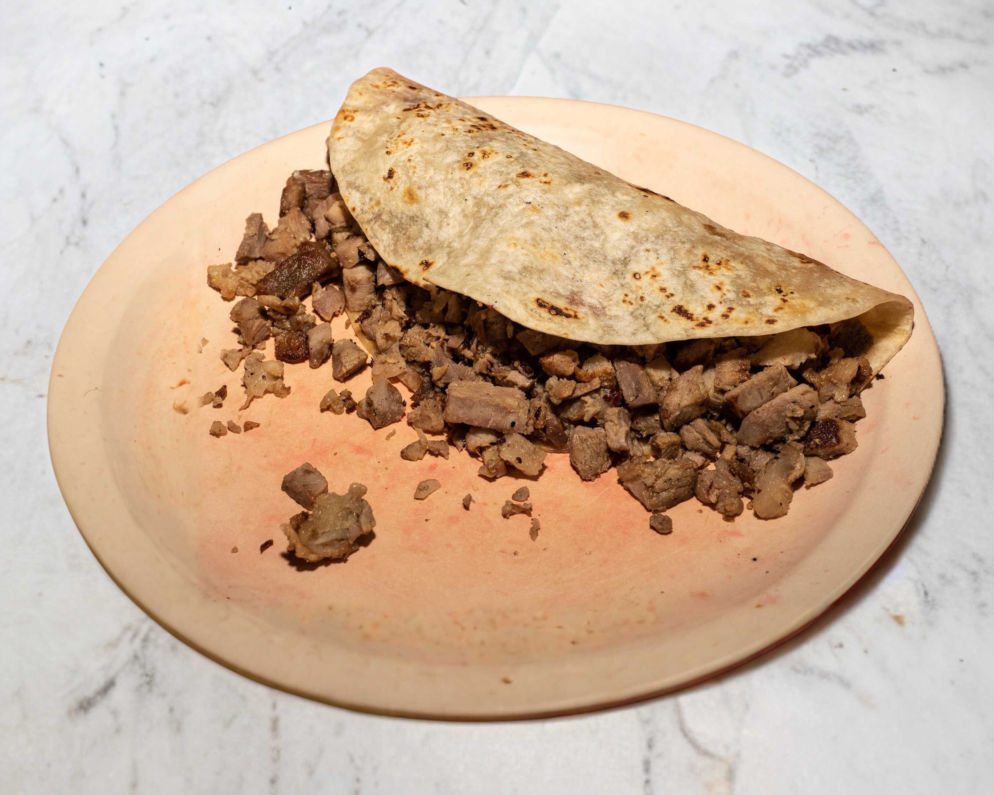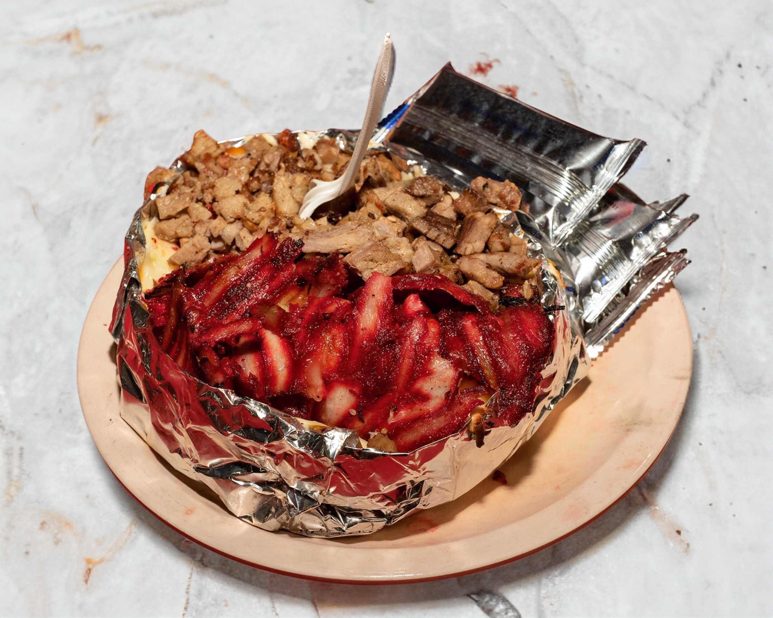 Papa asada al carbón, mantequilla, aderezo de queso amarillo, queso asadero con carne de trompo y bistec.