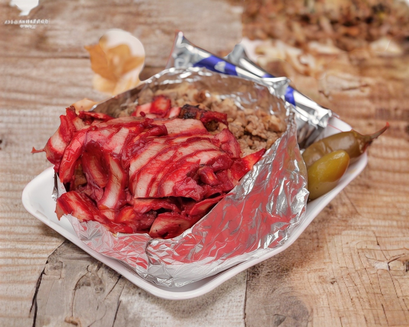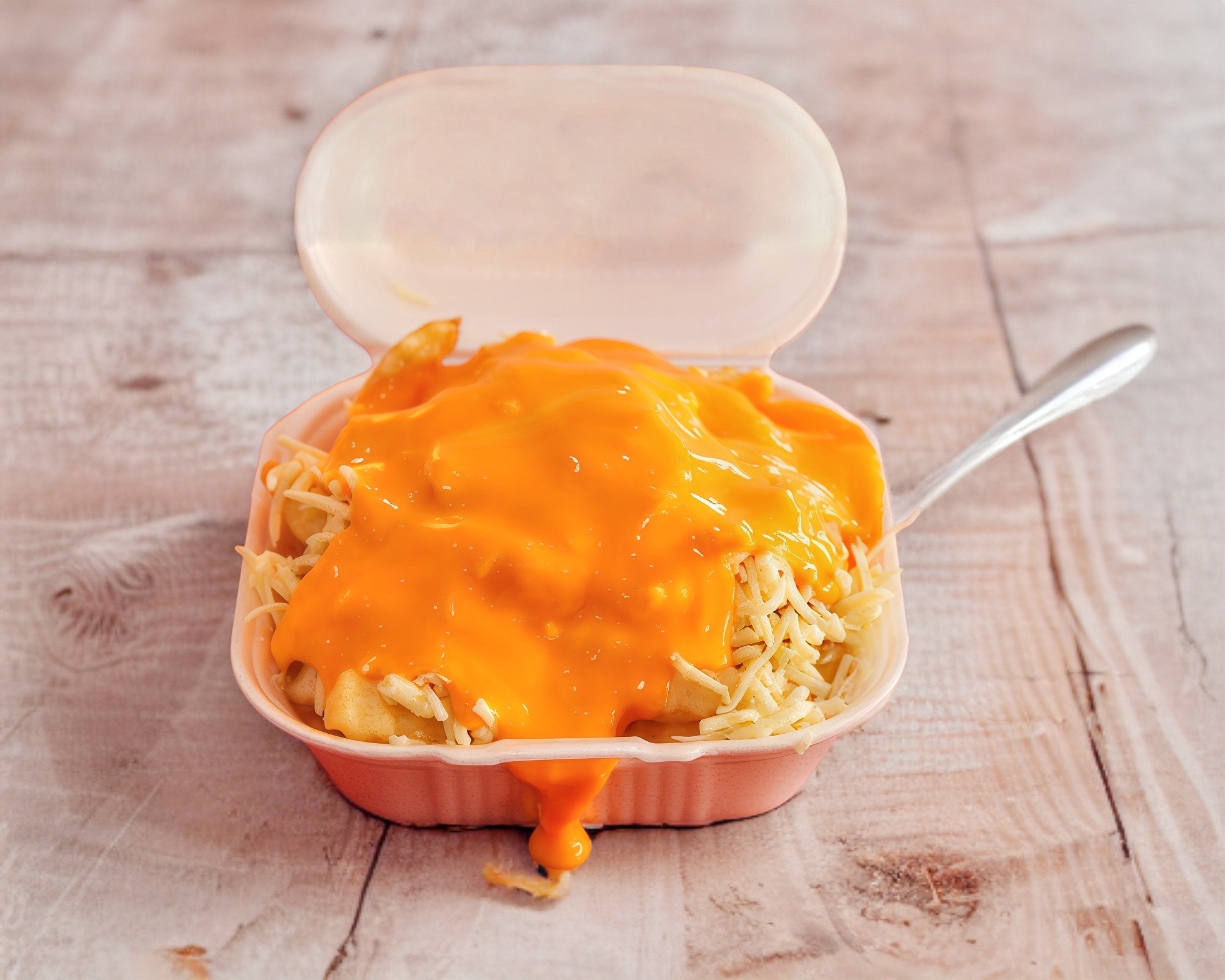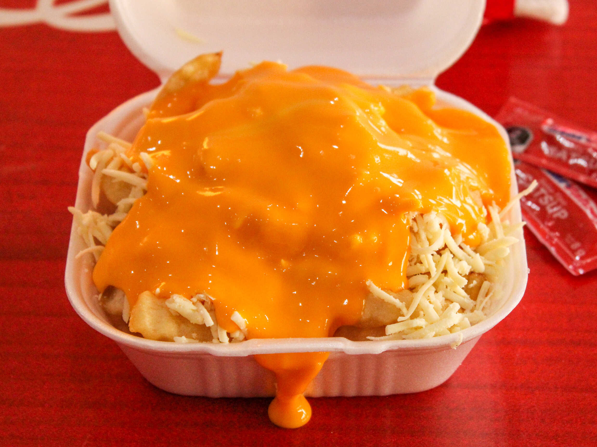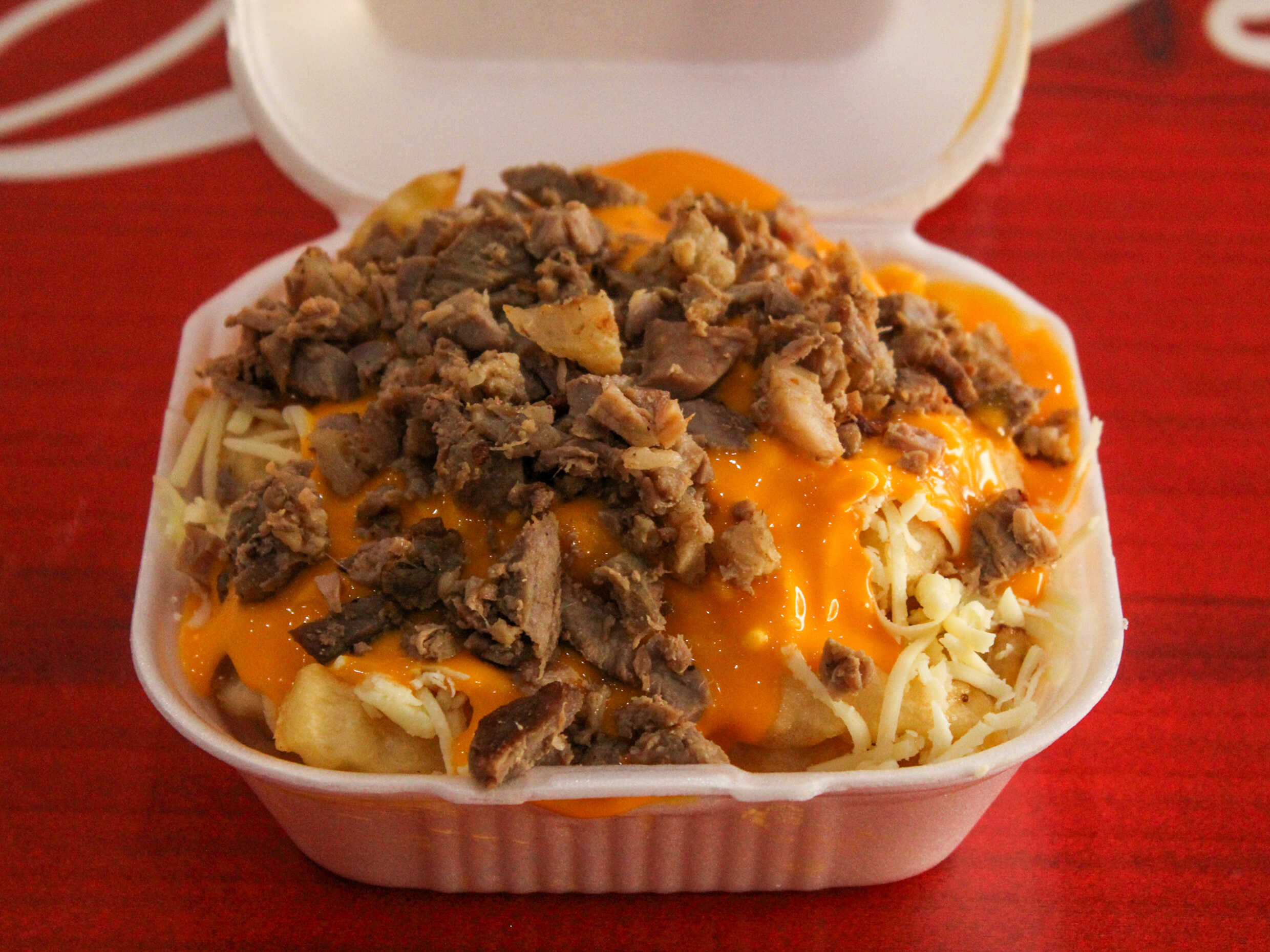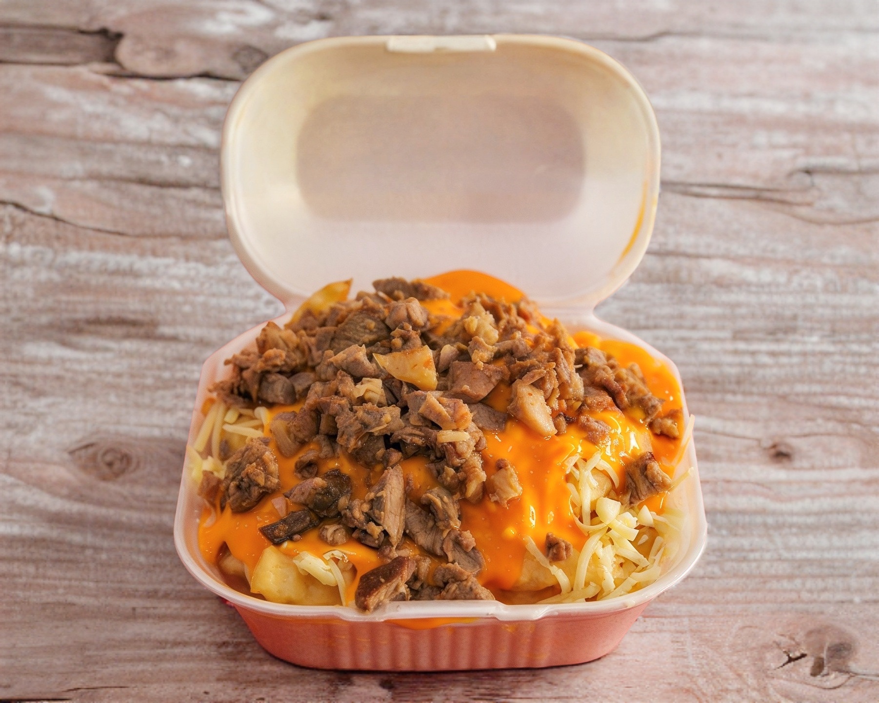 Aderezo de queso amarillo, queso blanco y carne de trompo o bistec.