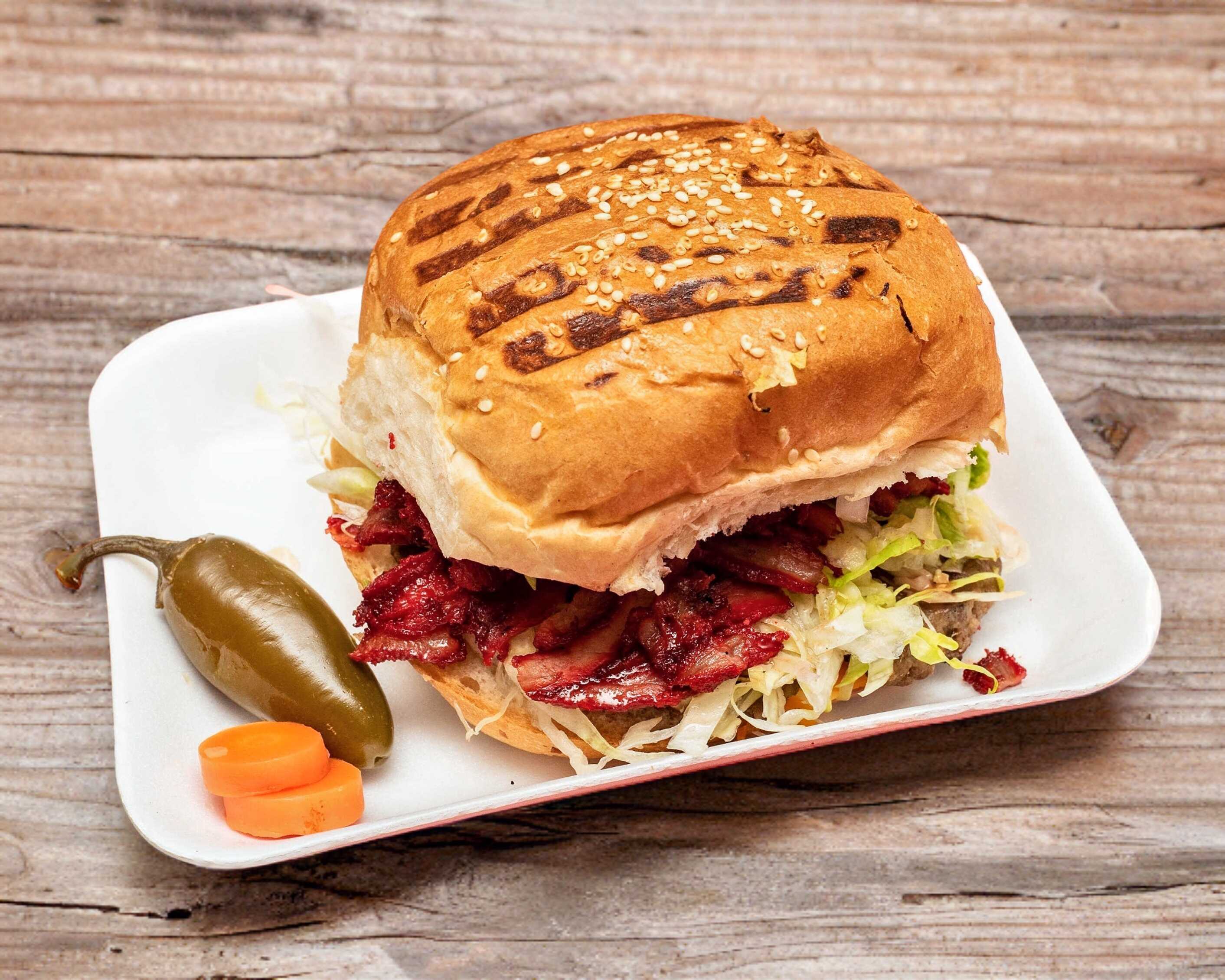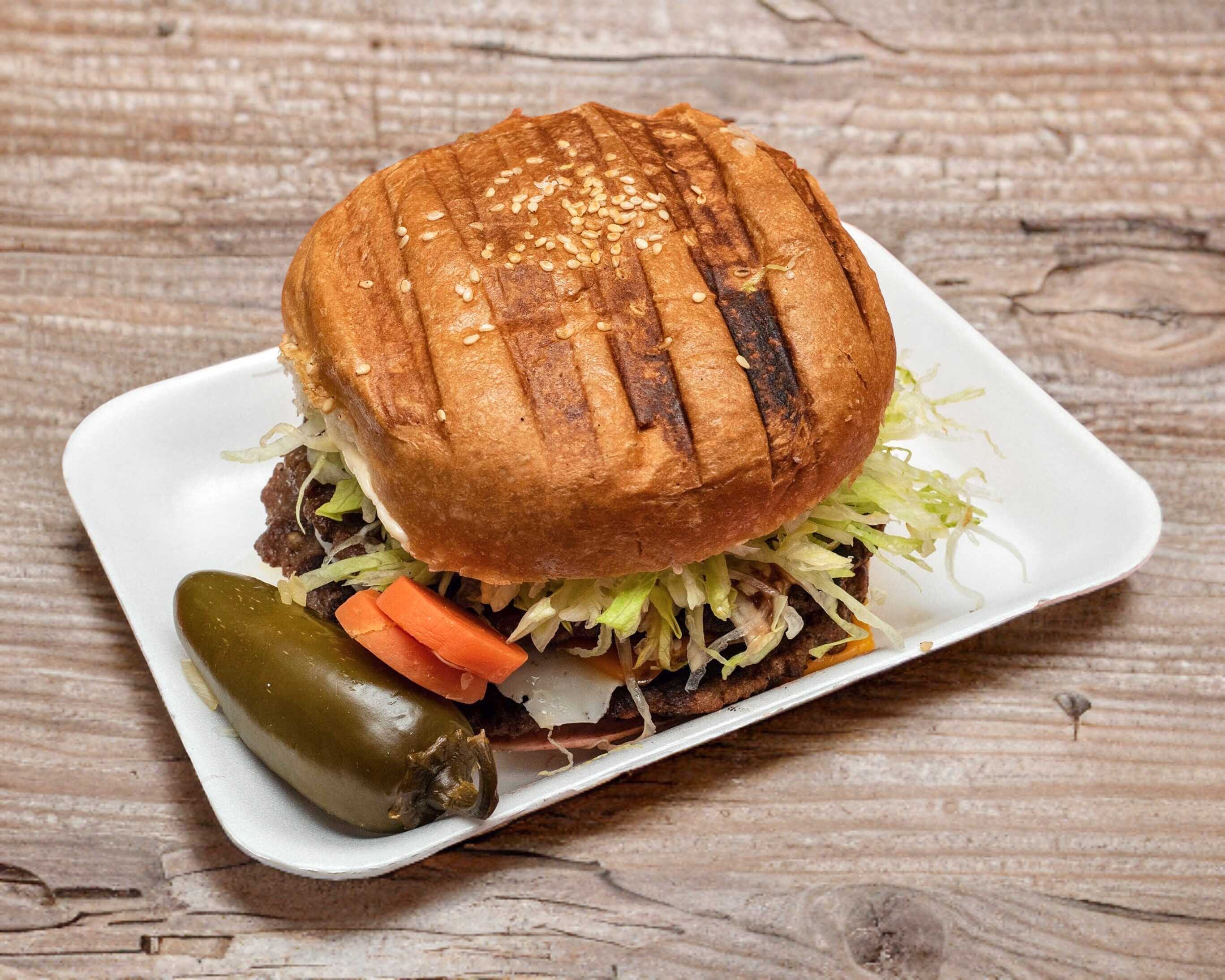 Con doble carne de res, mayonesa, mostaza, cátsup, tomate, lechuga, cebolla, aguacate, jamón y quesos blanco y amarillo.