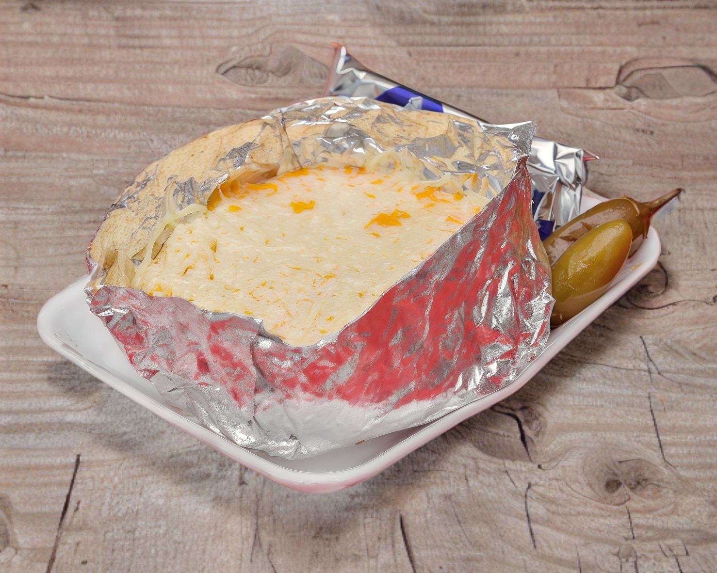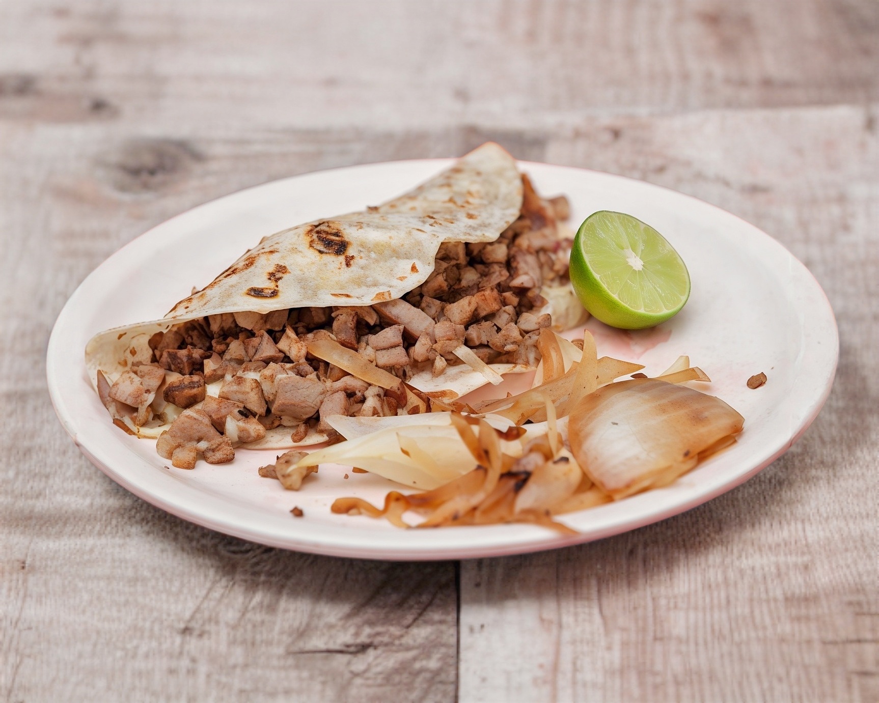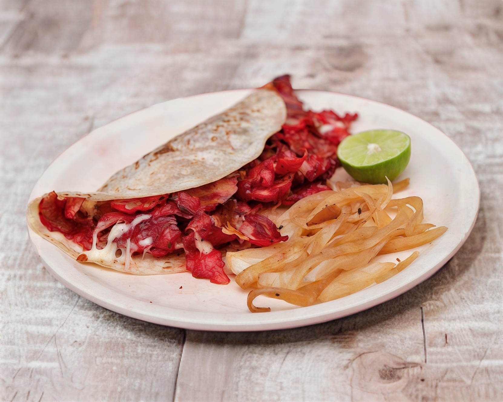 Carne de trompo con queso en tortilla de harina.