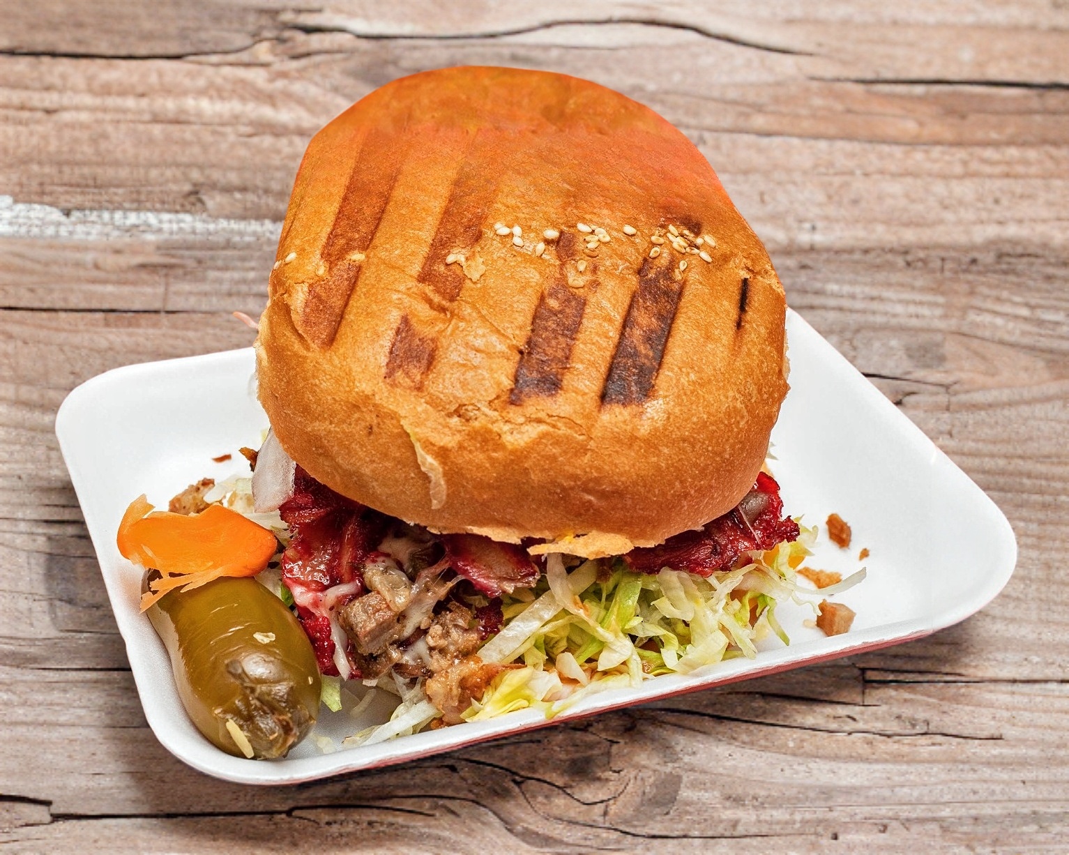 Carne de res con carne de trompo, mayonesa, mostaza, cátsup, tomate, lechuga, cebolla, aguacate, jamón y quesos blanco y amarillo.