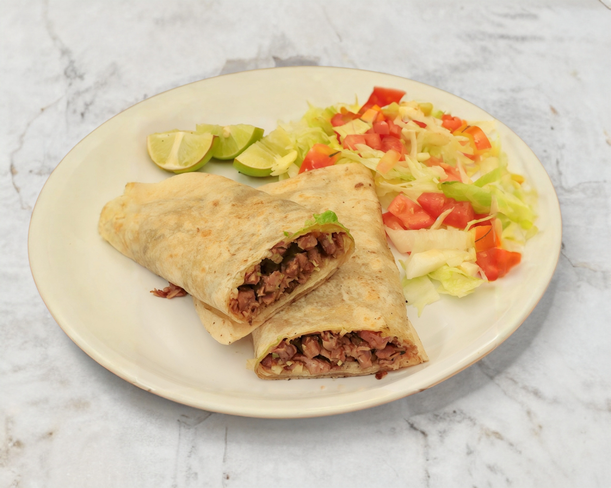 Tortilla jumbo, trae: Carne Asada, trompo, queso asado, cebolla, cilandro y a tu elección salsas, roja o verde.