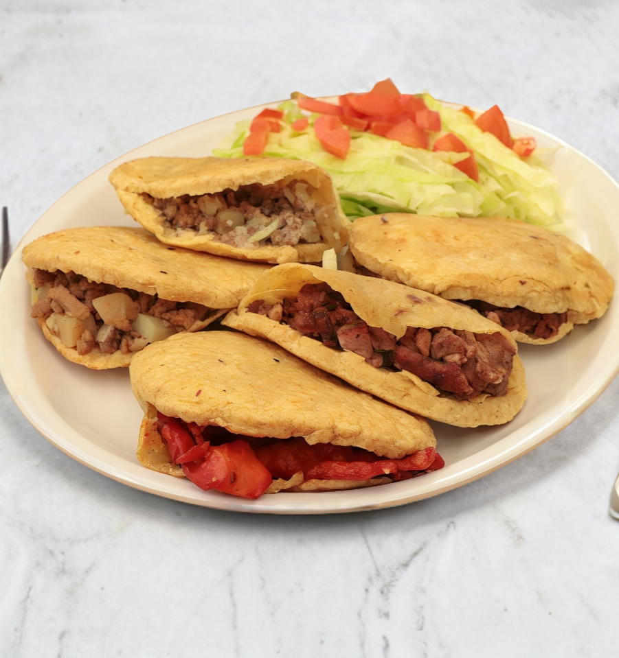 5 Piezas de gorditas de maíz (Guisos de tu elección) Incluye: lechuga, tomate, salsa verde y roja (se entregan aparte) PORCIÓN PERSONAL