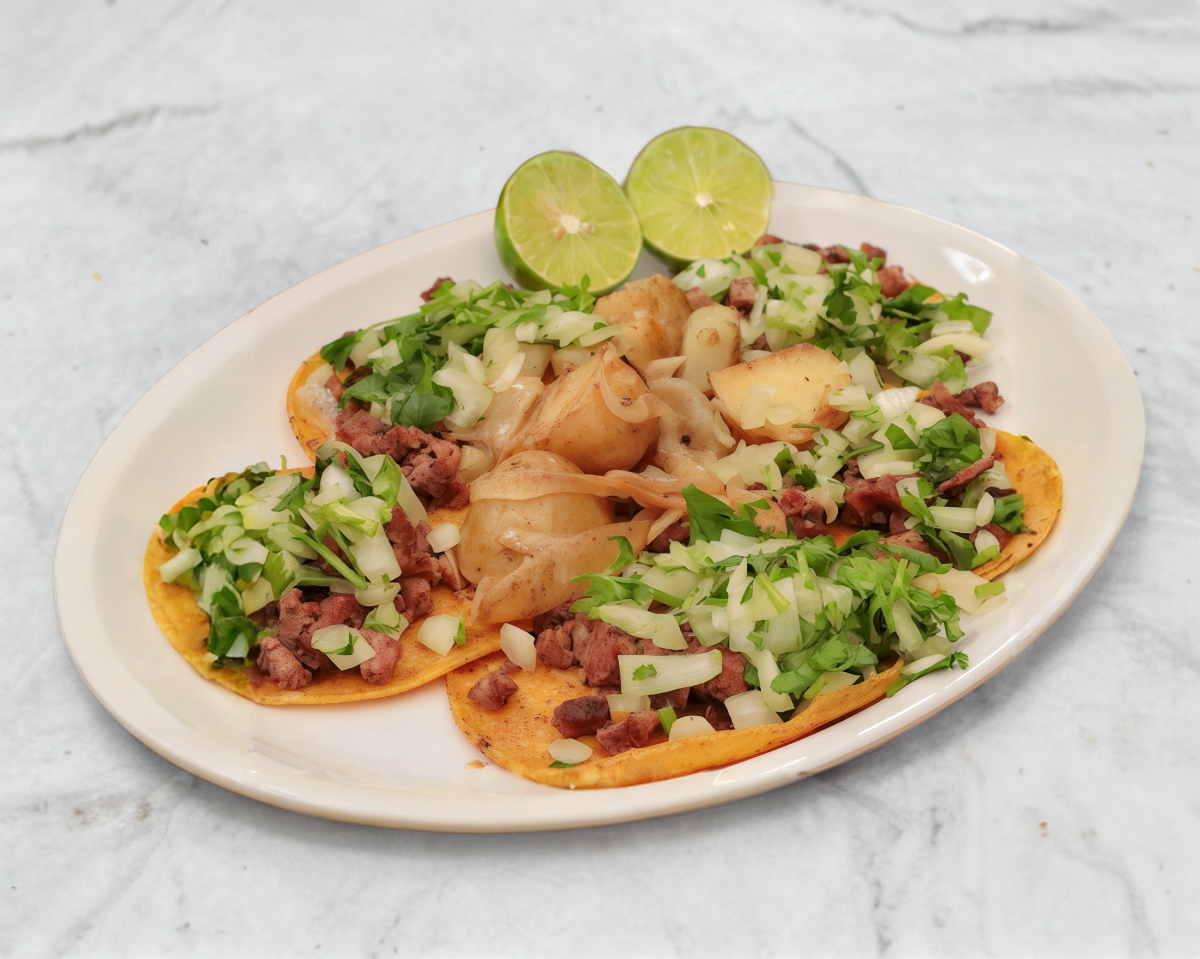 5 unidades de tacos (Elige tipo de tortilla entre maiz o harina) Incluye: Salsa verde, roja, cilantro, cebolla asada y limón.