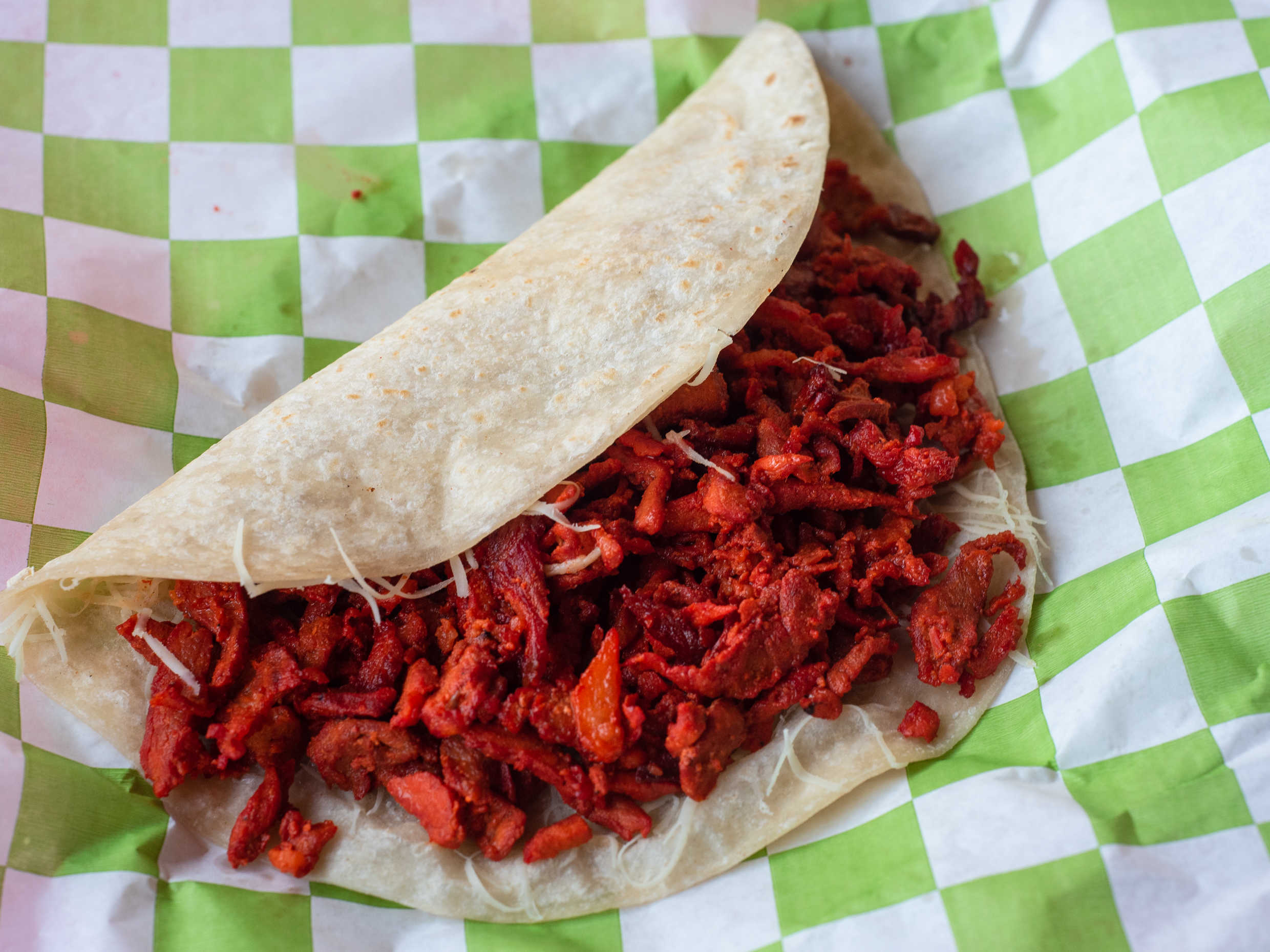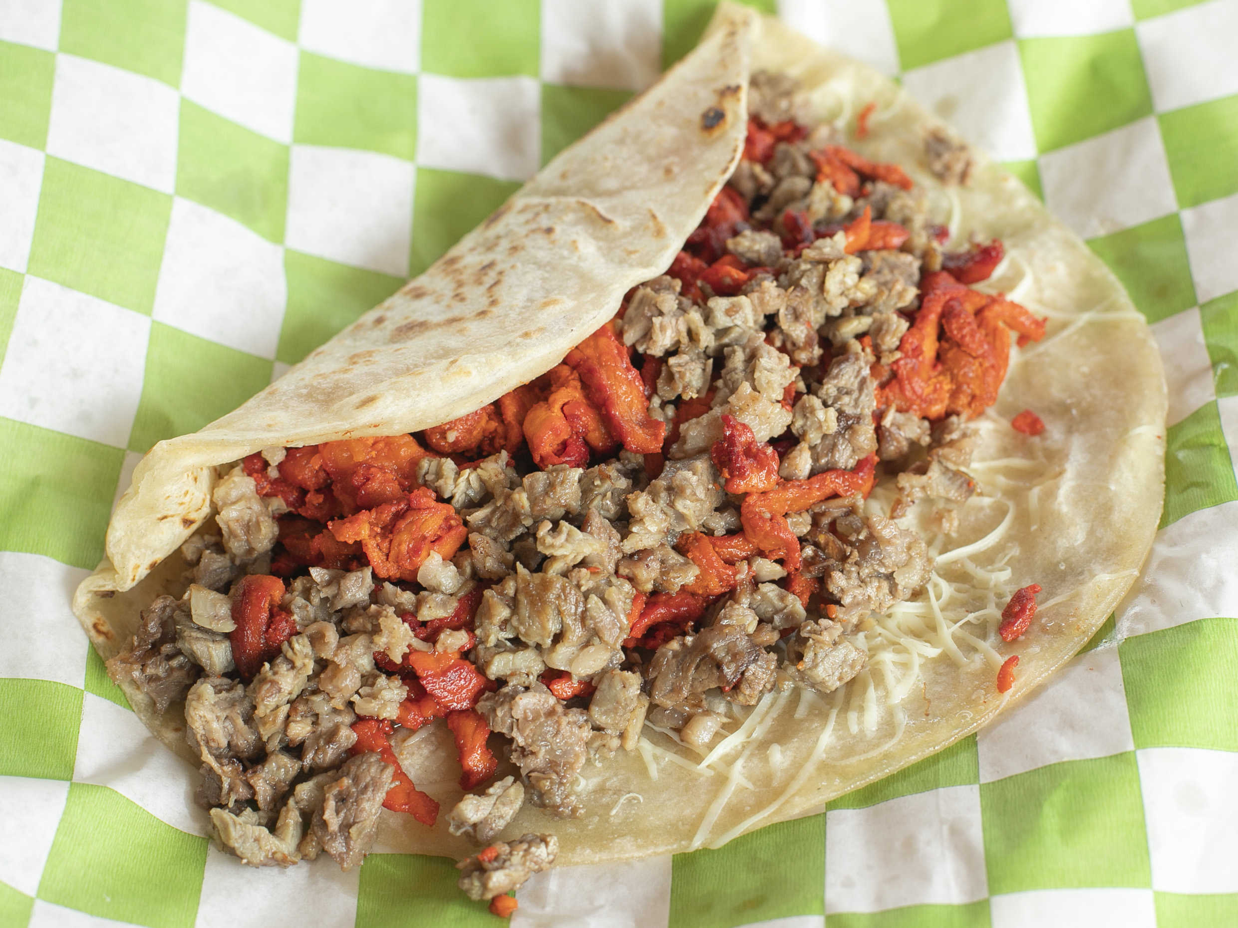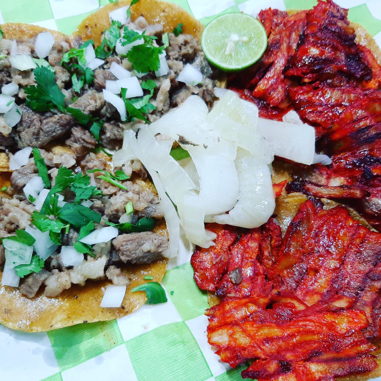 Tortilla de harina de 25 cm con trompo y bistec queso asadero salsas pico de gallo limones cebolla asada