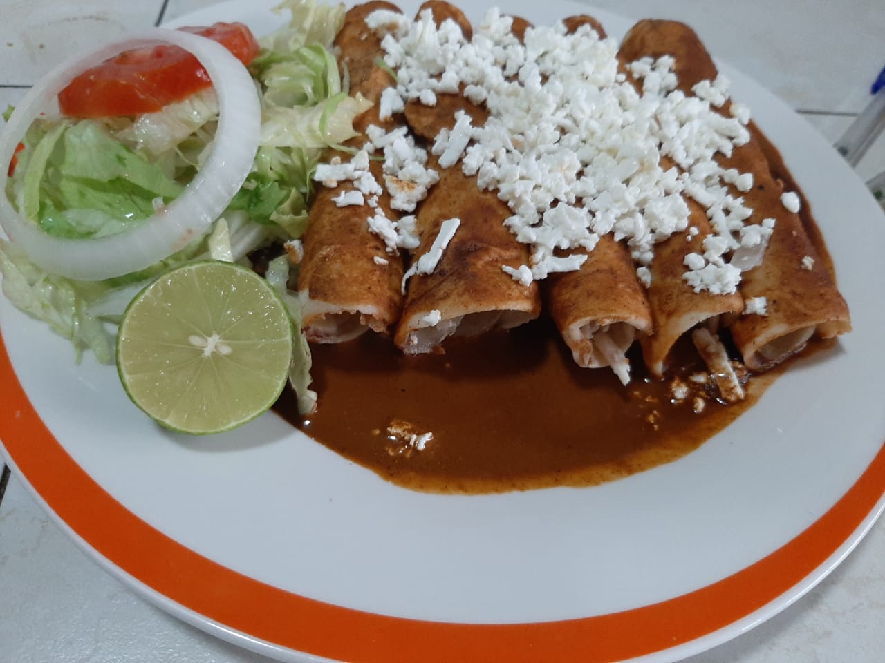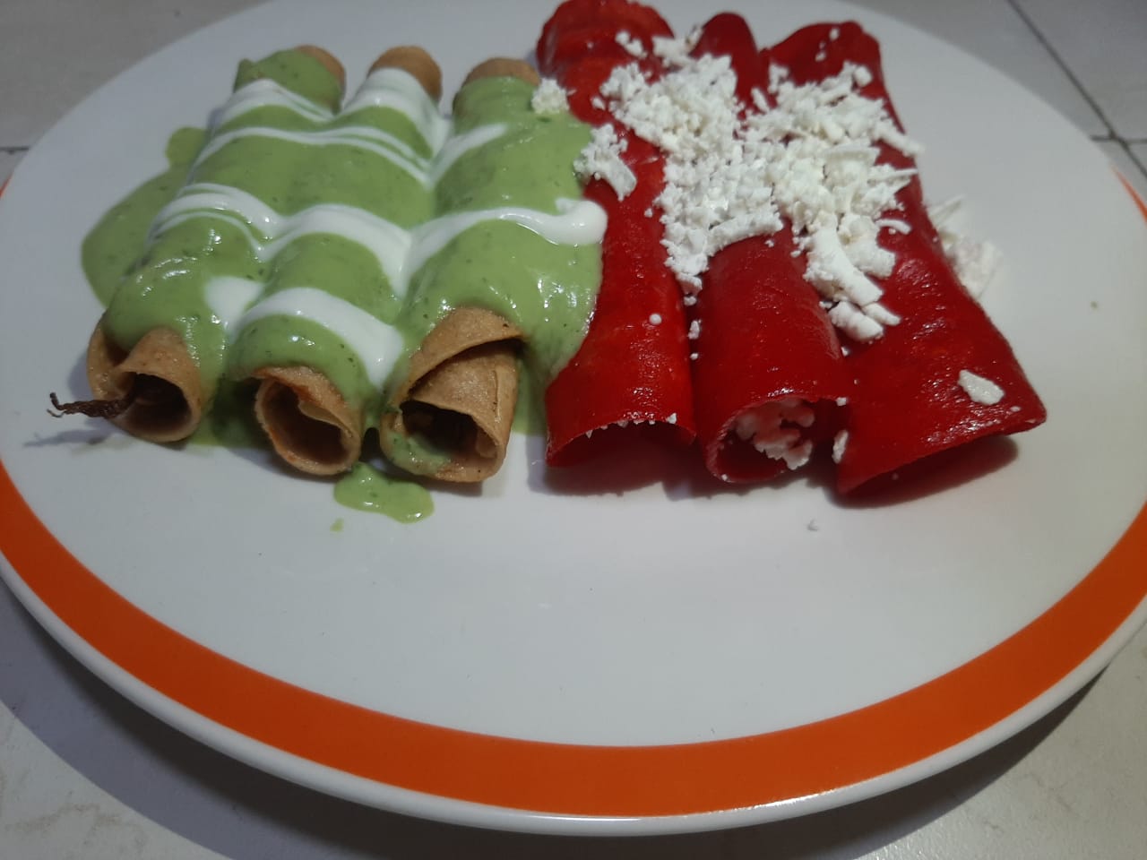 Orden con 6 pss 3 flautas 3 enchiladas Rojas ensalada guacamole y crema salsas