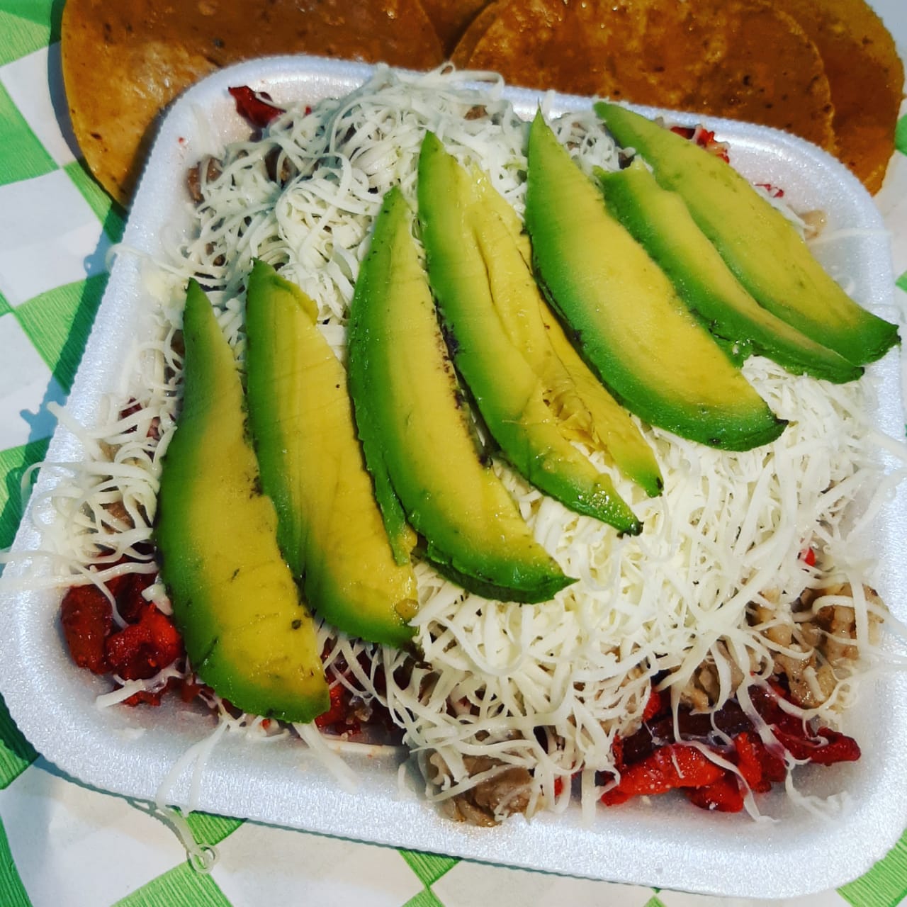 Desebrada salchicha lechuga jitomate cebolla chile en vinagre frijoles refritos