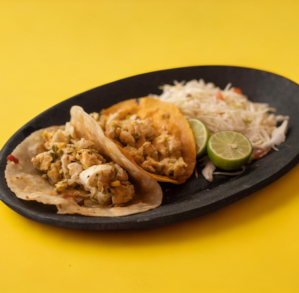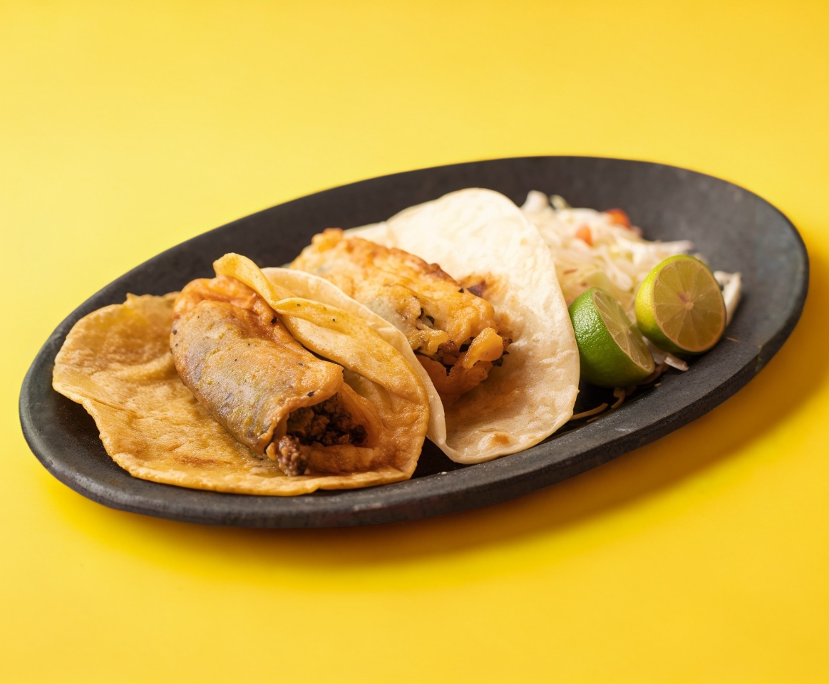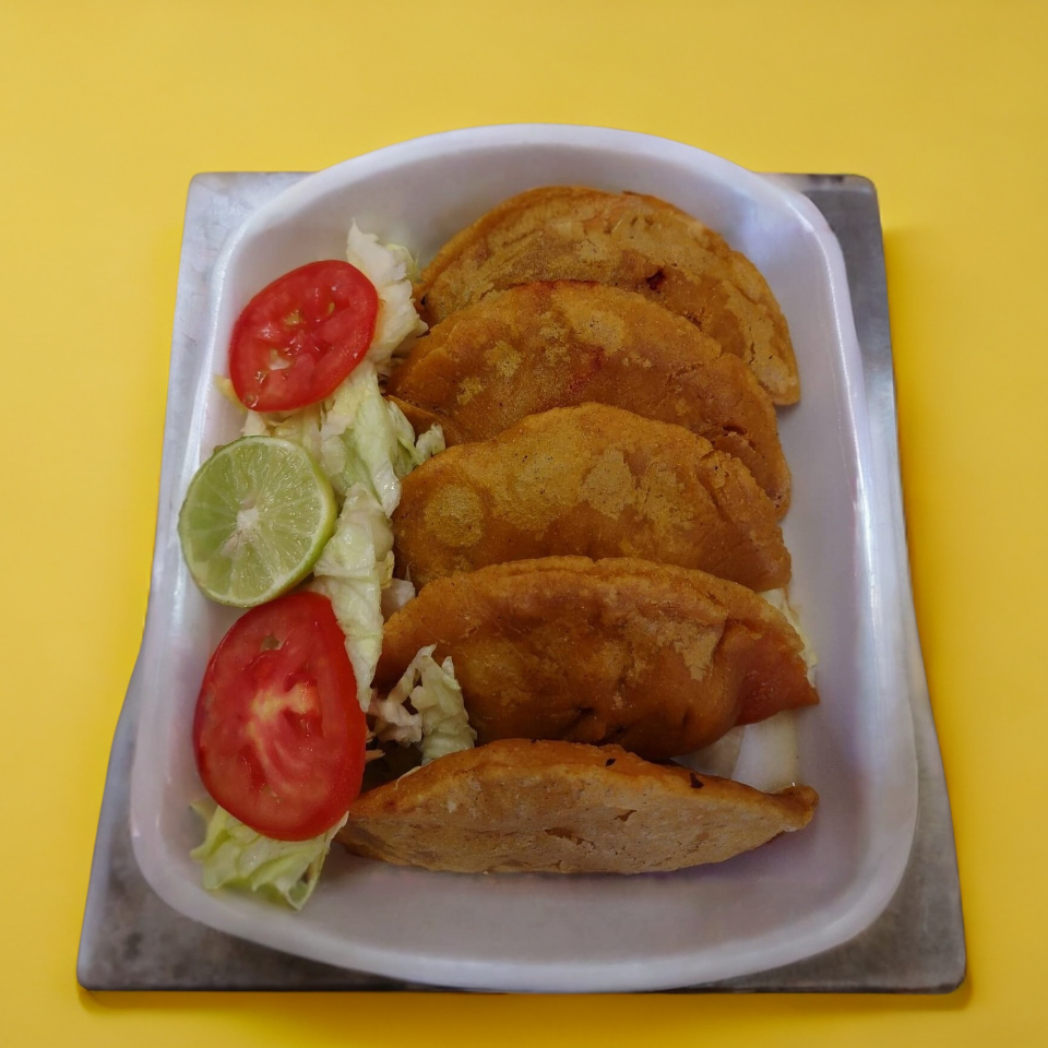Tortilla de maíz recién hecha, dorada en aceite, relleno de pollo, acompañados de arroz, frijoles o verduras.