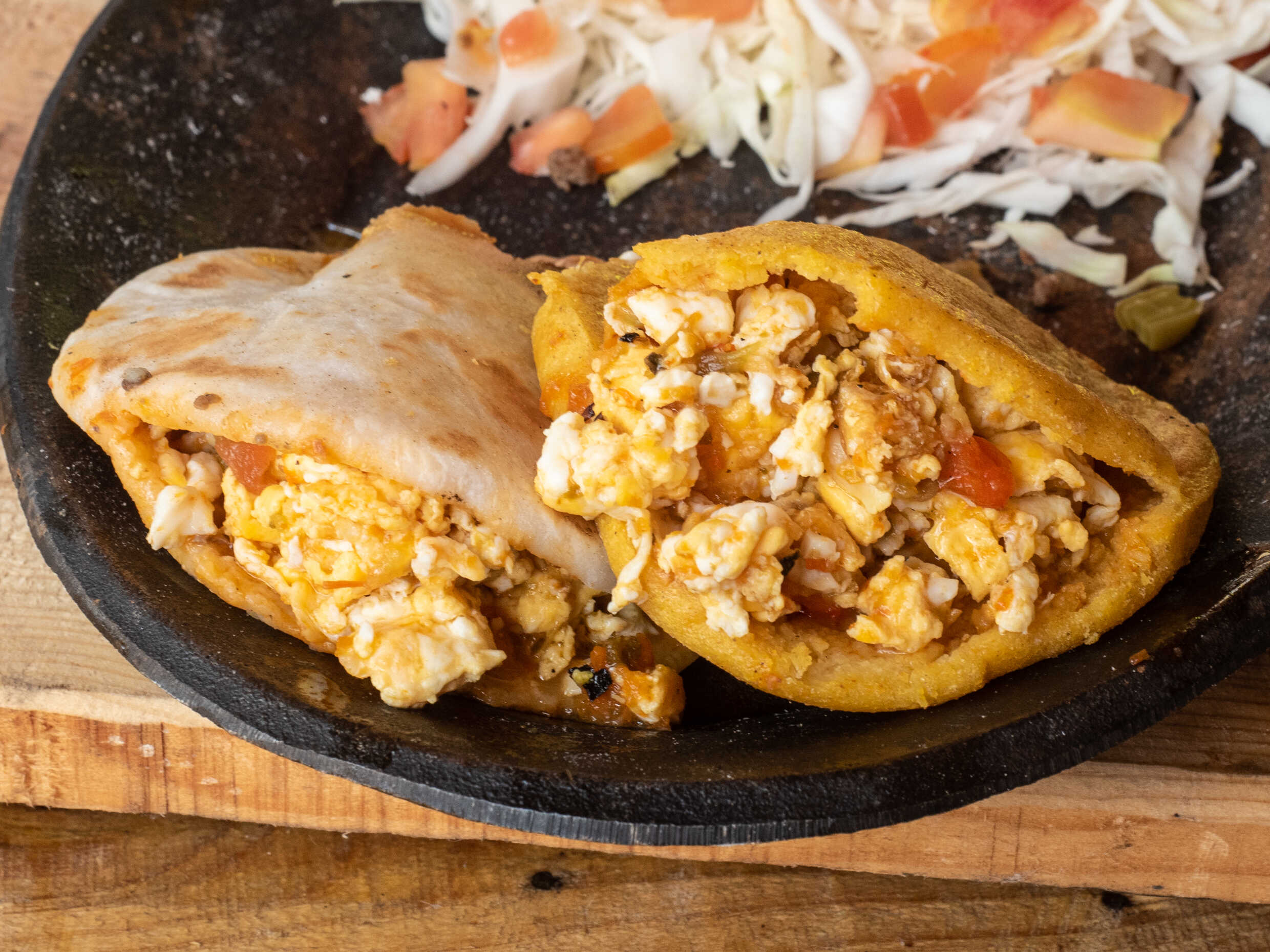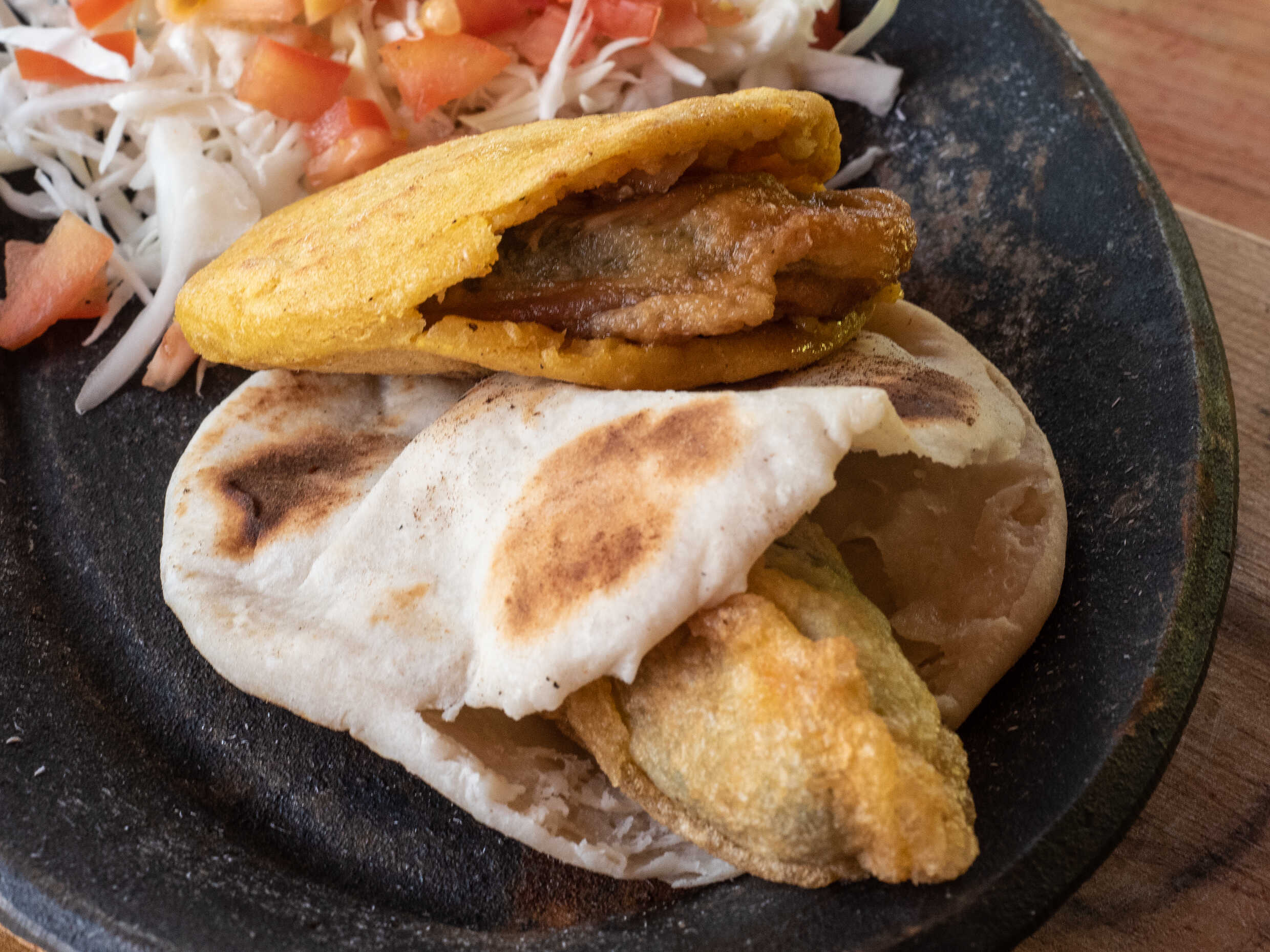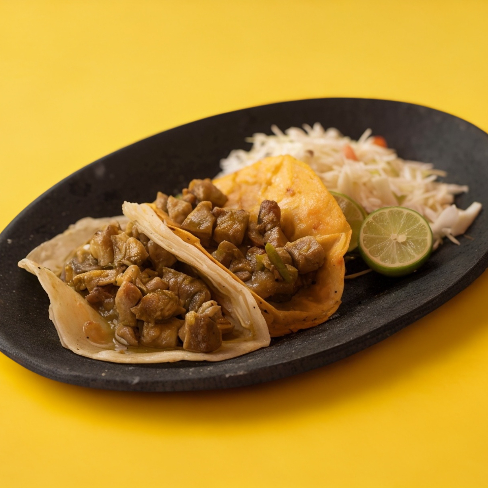 Tortilla de maíz recién hecha, dorada en aceite, relleno de pollo, acompañados de arroz, frijoles o verduras.