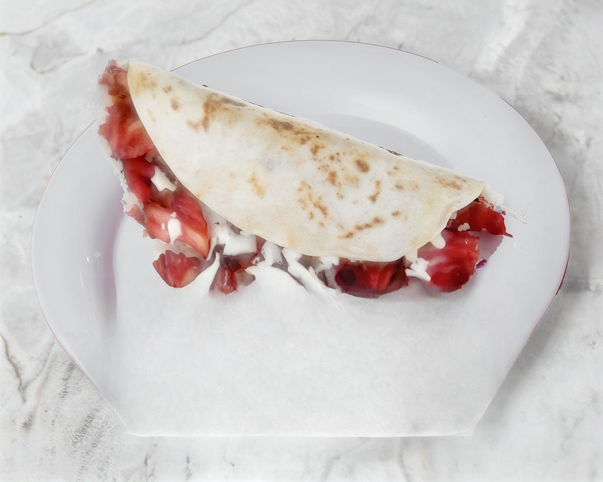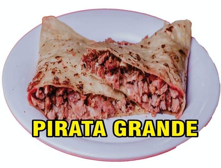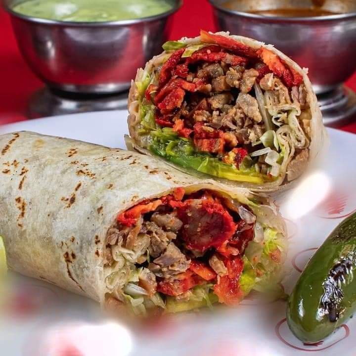 Tortilla de harina queso lechuga aguacate crema carne de trompo y bistec