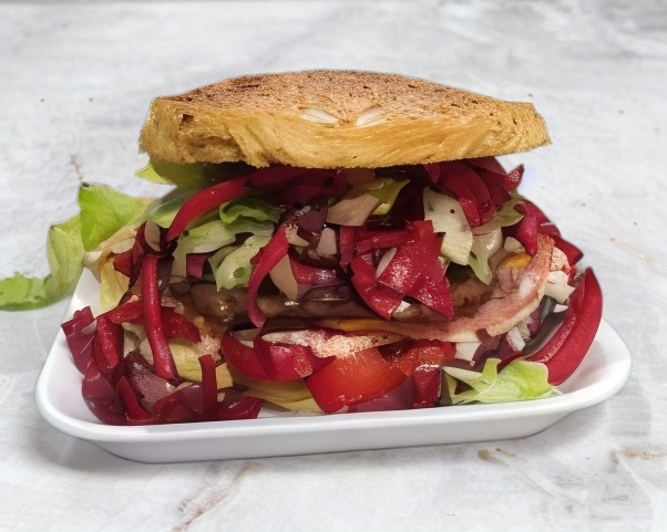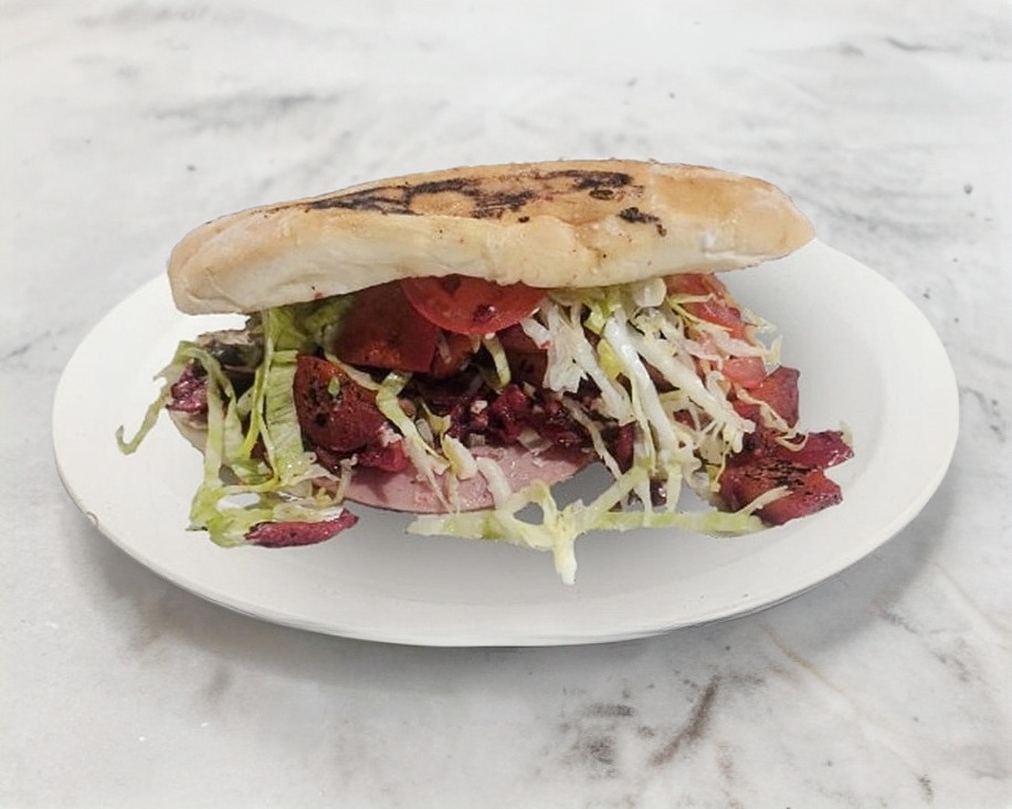 Bimbollo super, mayonesa, cátsup, aguacate, tomate, lechuga, jamón, queso amarillo, carne de trompo y queso asadero.
