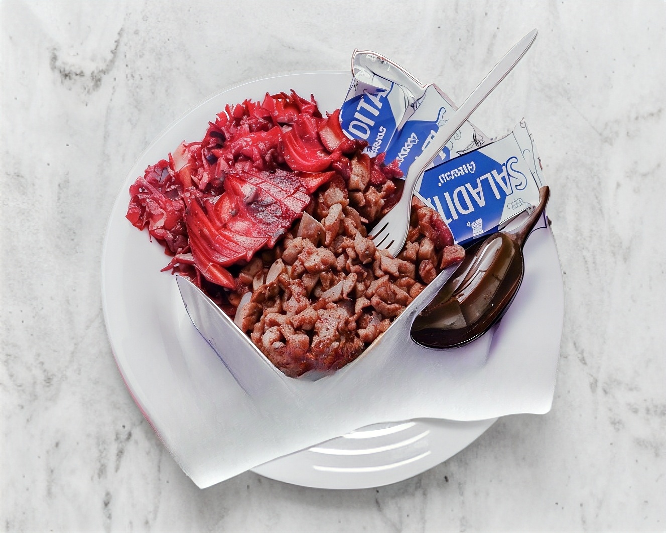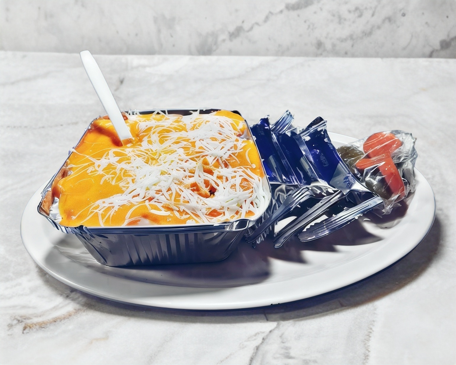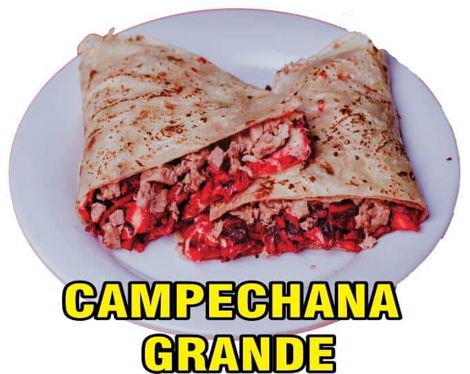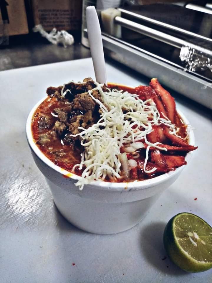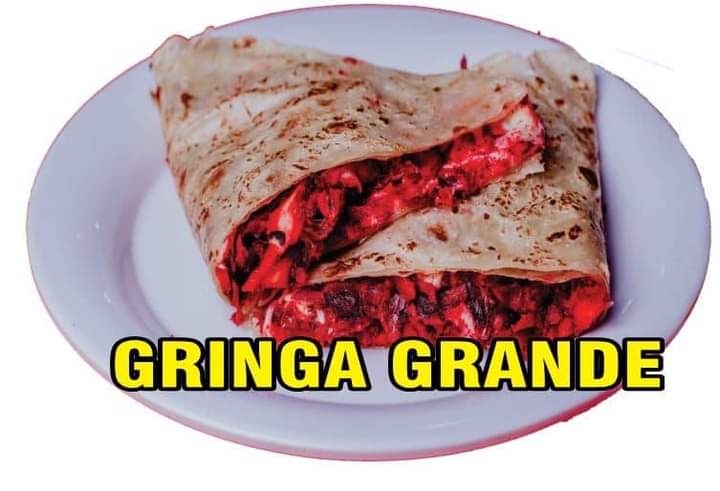Tortilla de harina, carne de res con queso asadero, cebolla picada, guisada, salsa verde y roja.