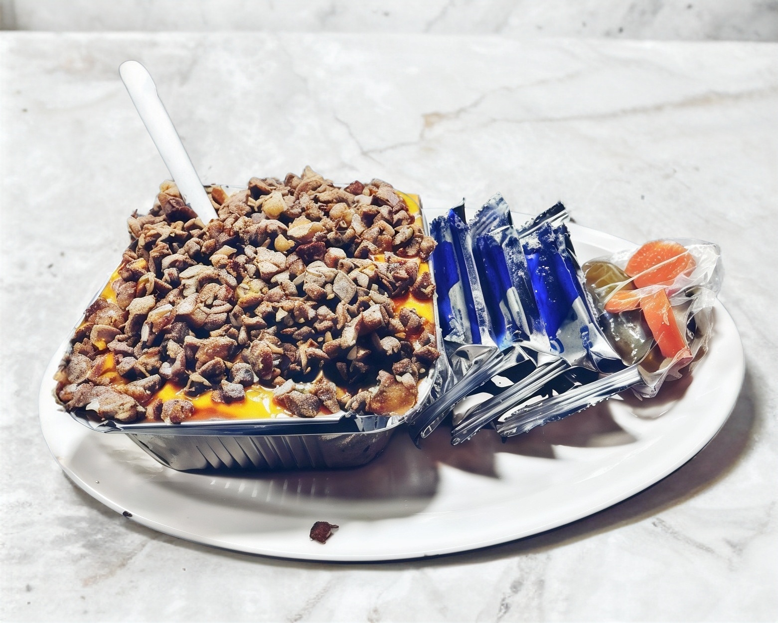 Papa asada con mantequilla, queso amarillo, queso asadero, carne de res, tres galletas saladas y jalapeño.