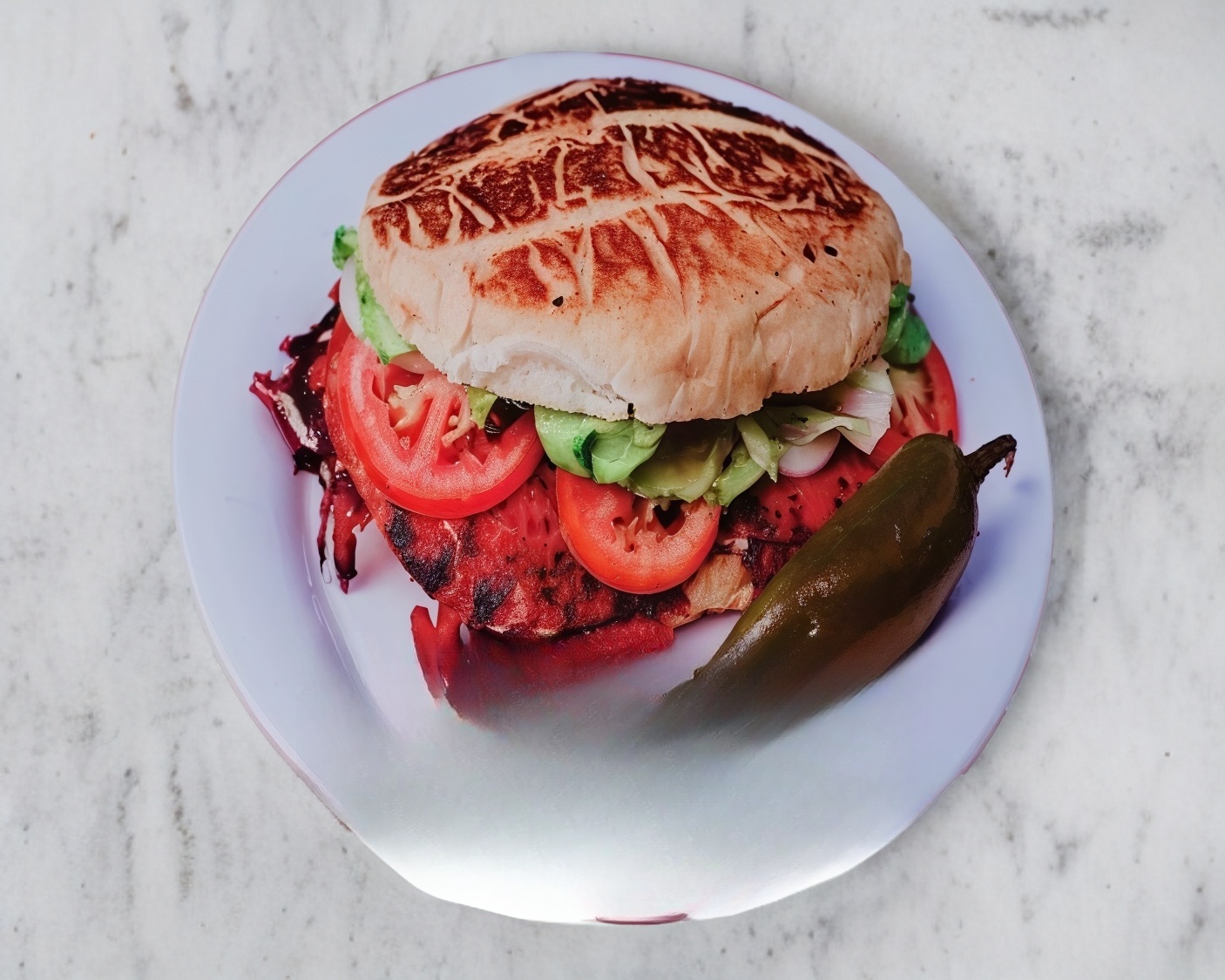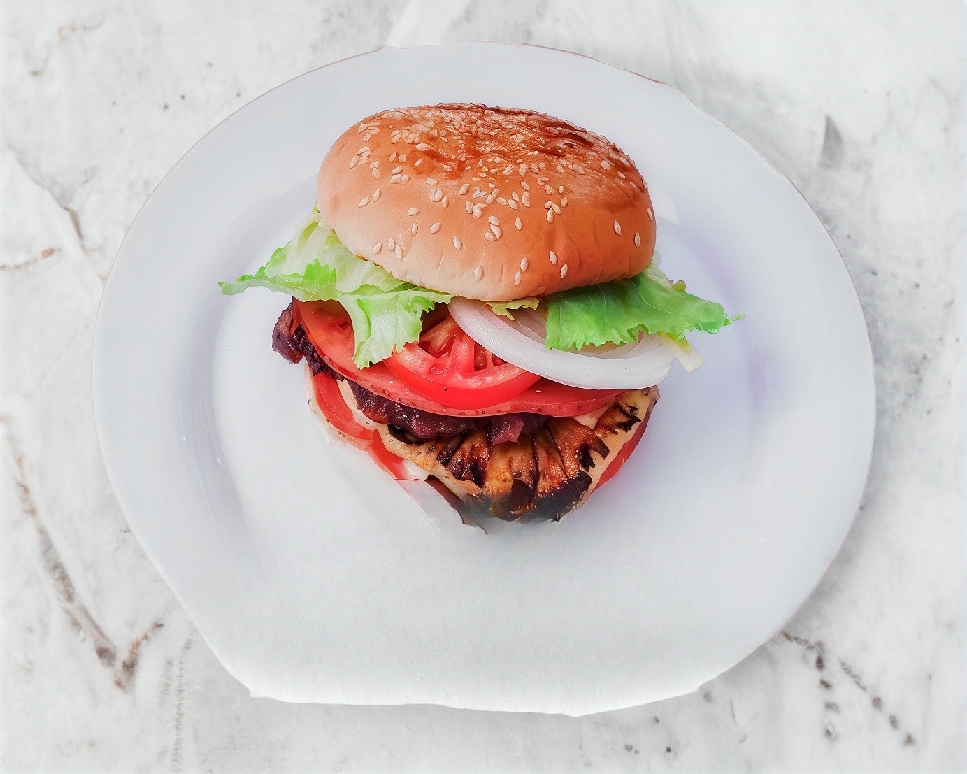 Bimbollo super, carne de hamburguesa, piña, jamón, queso amarillo, asadero, mayonesa, cátsup, aguacate, tomate y lechuga.