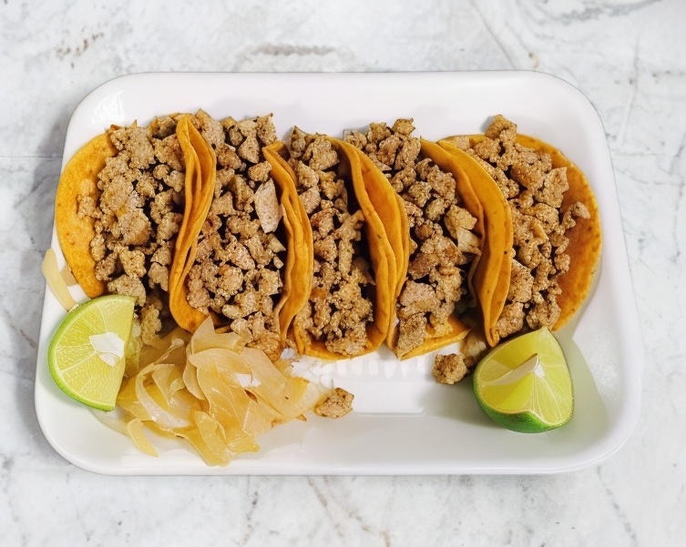 Doble tortilla de maíz, carne de res, cebolla picada, guisada, salsa verde y roja.