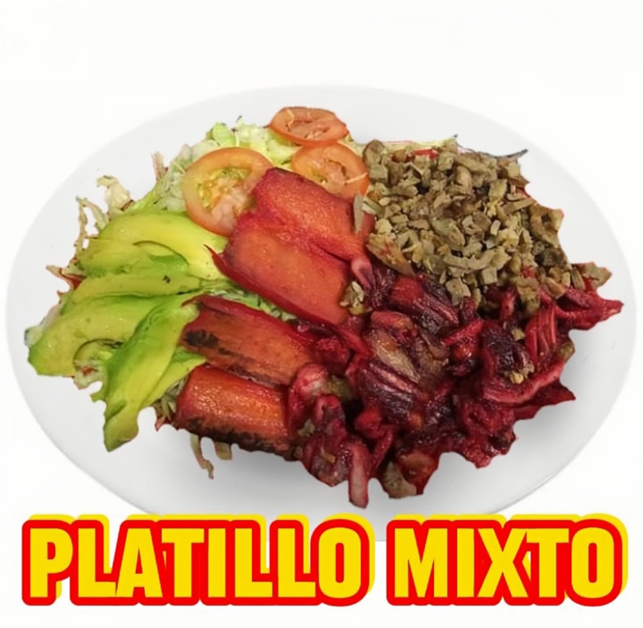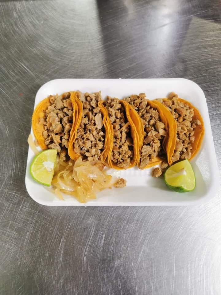Aguacate, doble tortilla de maíz con carne de res, aguacate, cebolla picada y guisada, salsa verde y roja.
