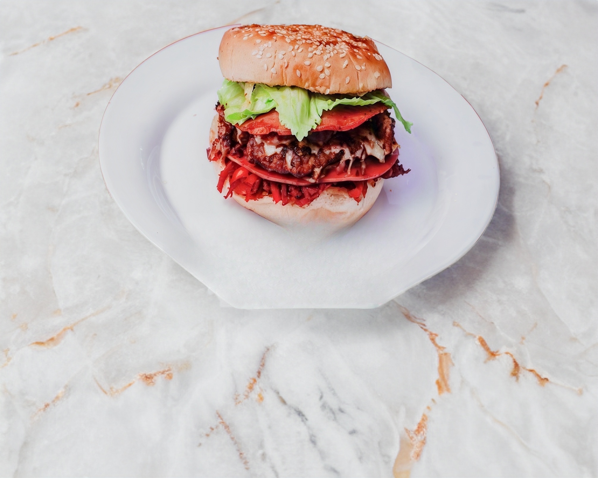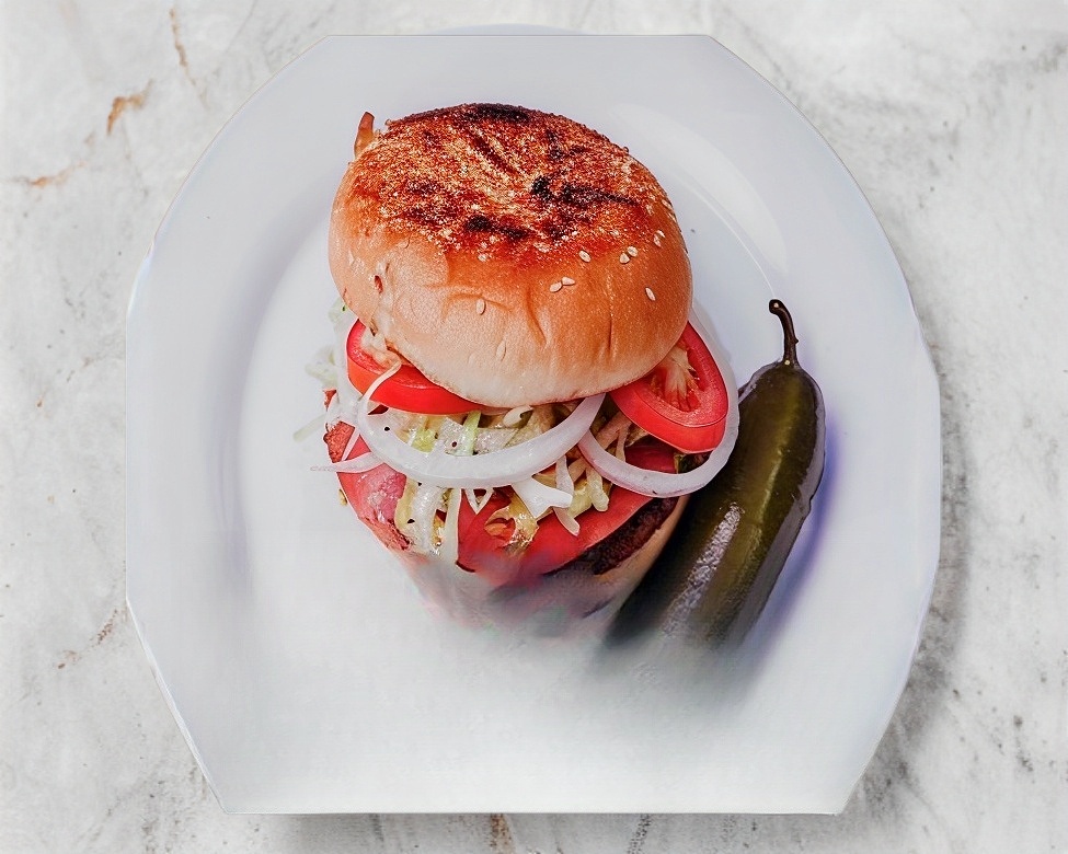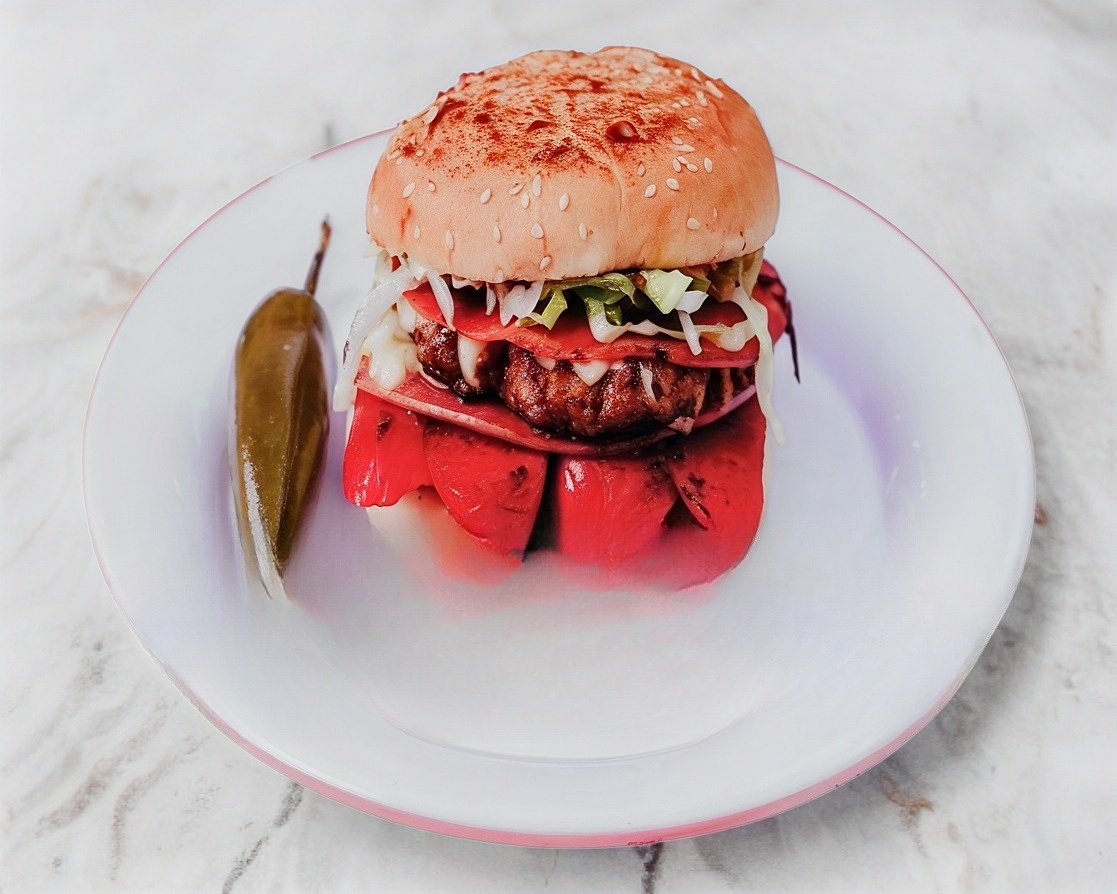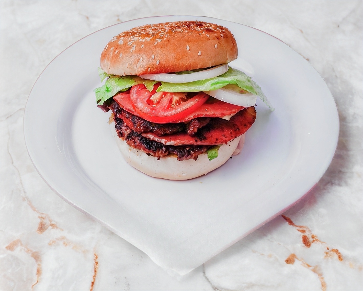 Carne de hamburguesa casera, trompo y bistec, mayonesa, cátsup, tomate, aguacate, jamón y queso amarillo.